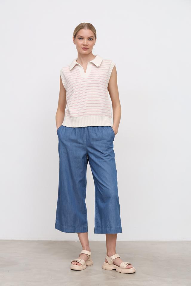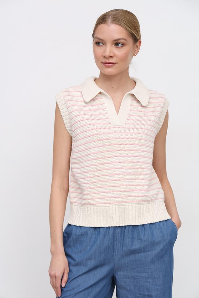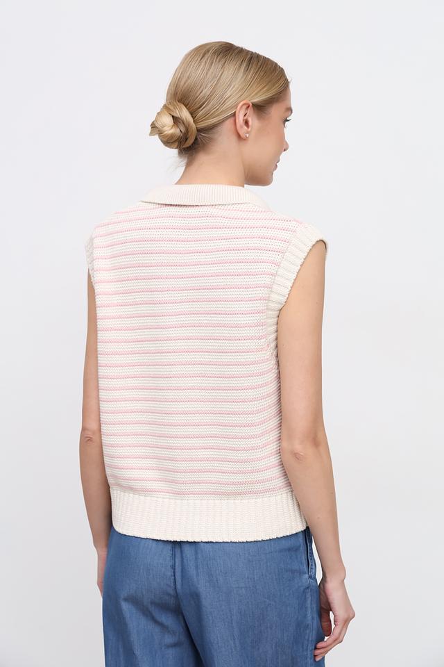 Пуловер имеет классический крой с V-образным вырезом и воротником-поло, что придает ему особый шарм. Без рукавов, что делает его идеальным для теплой погоды.