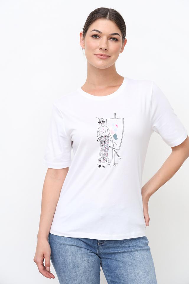 Футболка имеет прямой крой и короткие рукава, что делает ее универсальной для различных образов. Главная особенность этой модели — стильный принт с изображением художницы за мольбертом, выполненный в графичной манере.