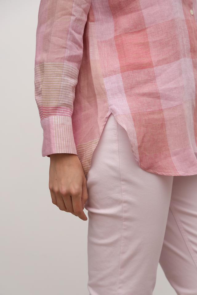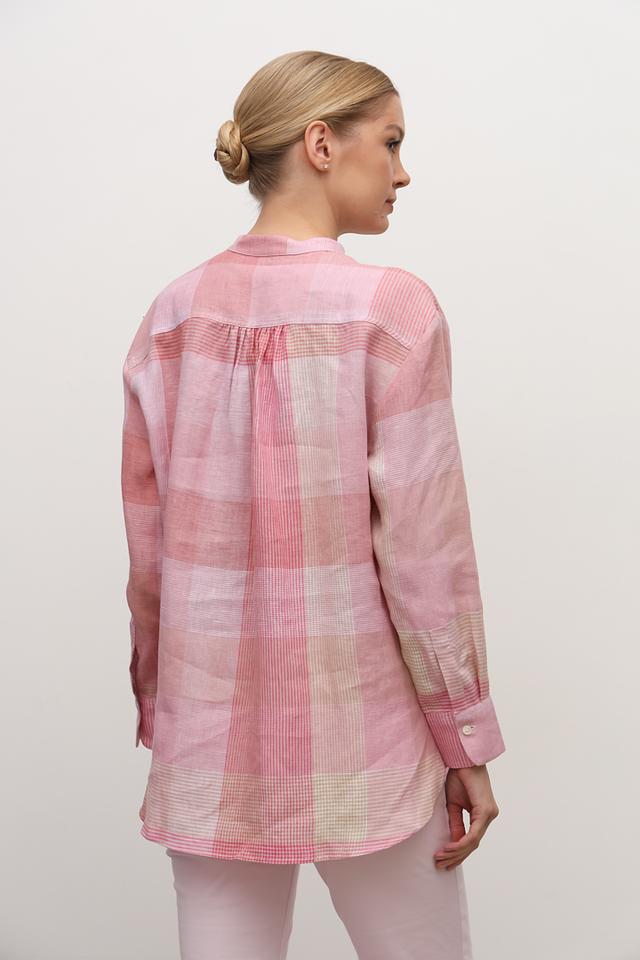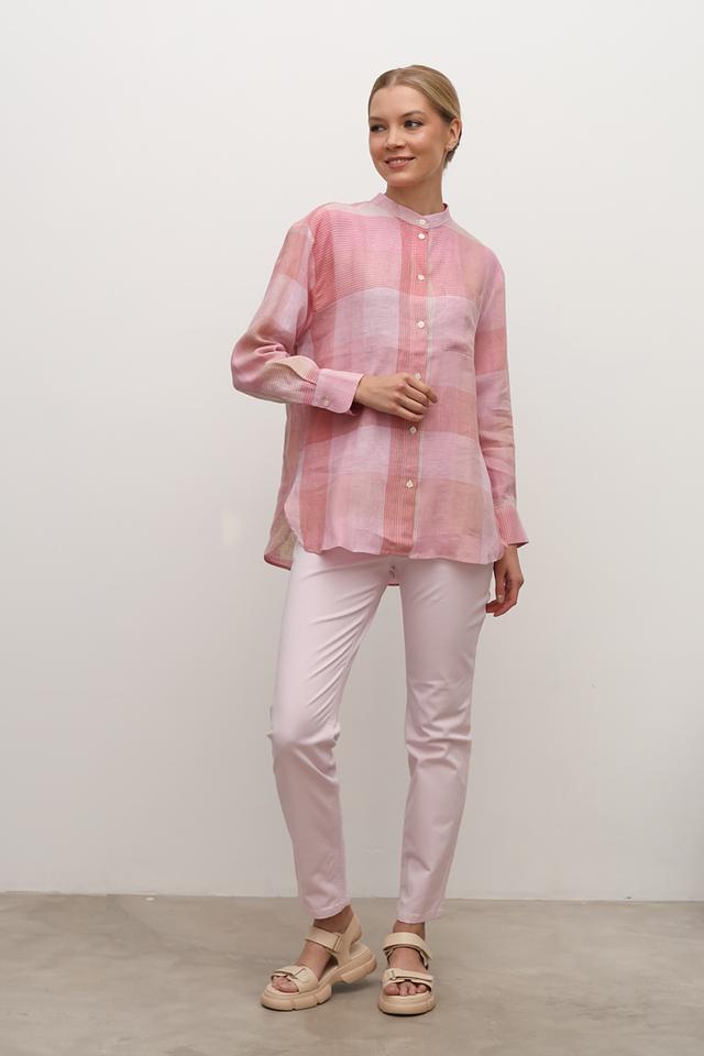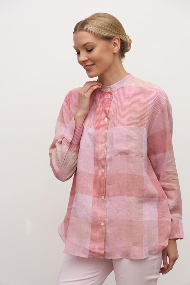Розовая рубашка Maerz из 100% льна с клетчатым принтом и длинным рукавом. Эта модель отличается свободным кроем и воротником-стойкой, что делает ее идеальным выбором для создания легких и стильных образов. Состав: лен 100%