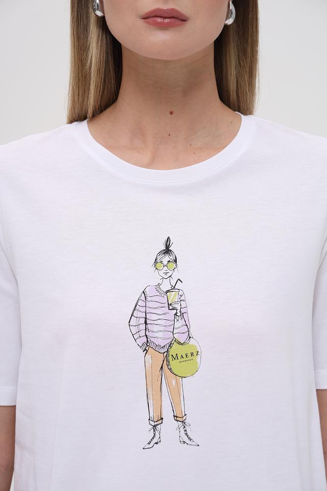 Белая футболка от Maerz с оригинальным принтом в виде стилизованного изображения девушки. Изготовлена из мягкого и приятного к телу сочетания хлопка и модала, обеспечивающего комфорт в носке. Состав: хлопок 50%, модал 50%