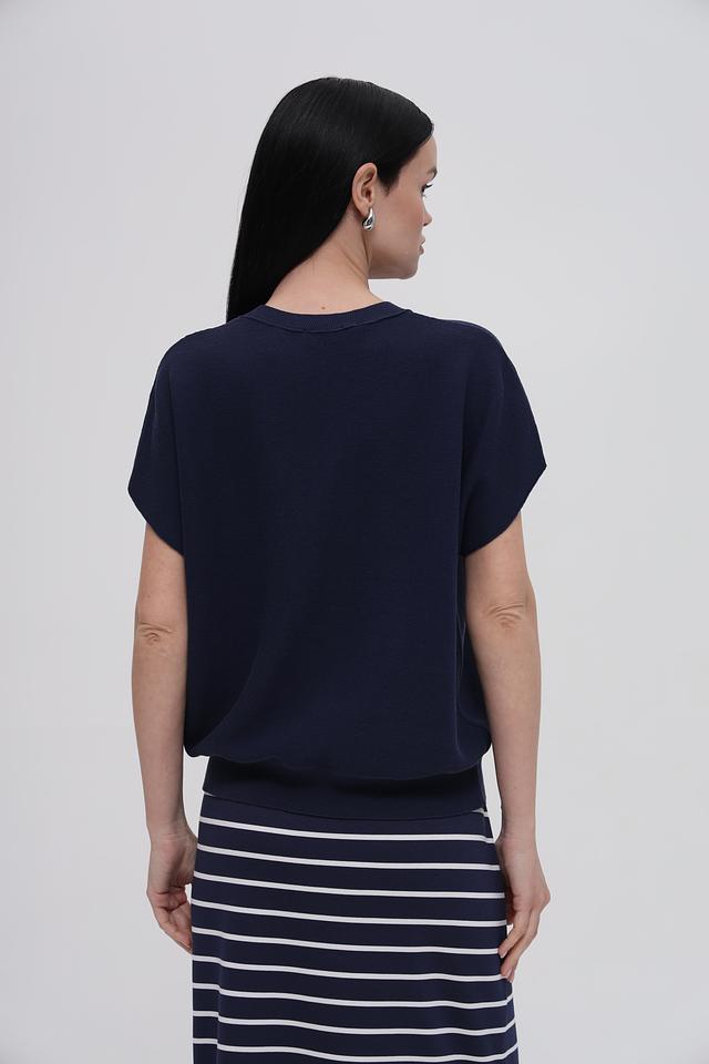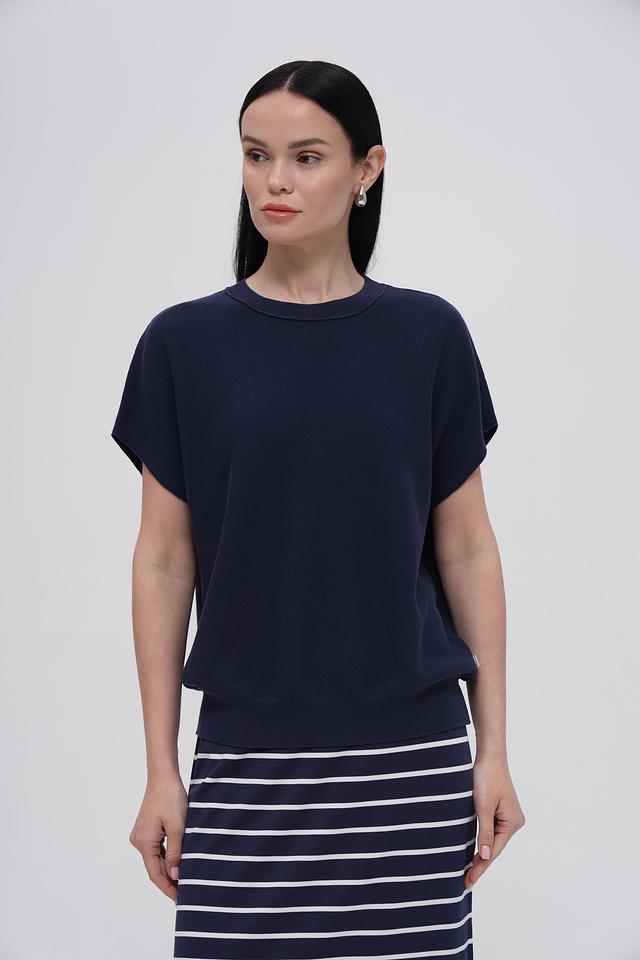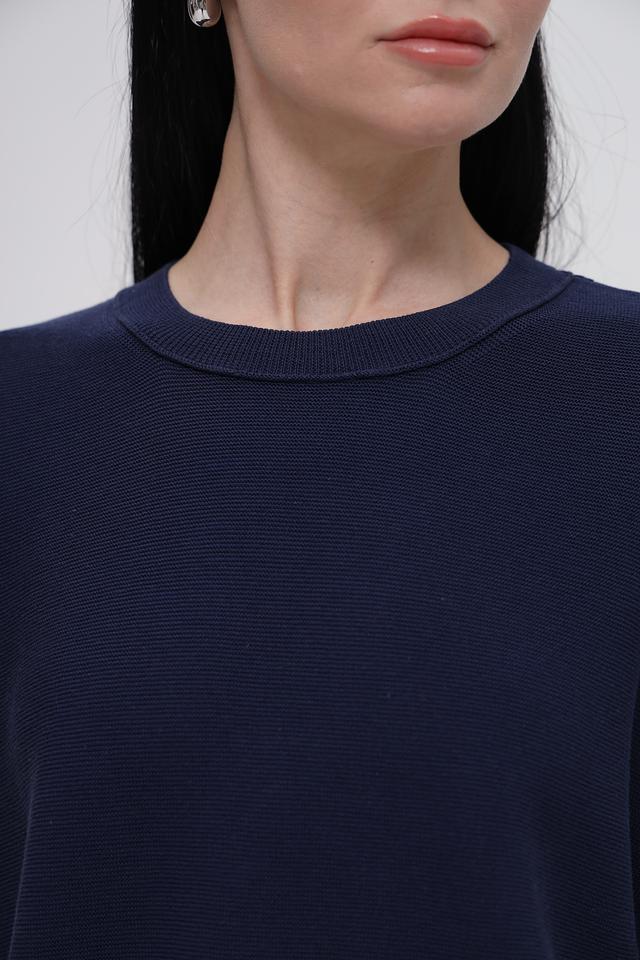 Модель имеет прямой крой и круглый вырез горловины. Короткие рукава делают пуловер удобным для теплой погоды. Текстура ткани выполнена в виде мелкой вязки, что придает изделию аккуратный и стильный вид.