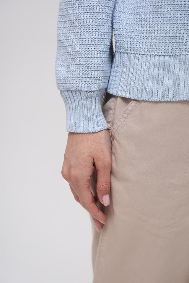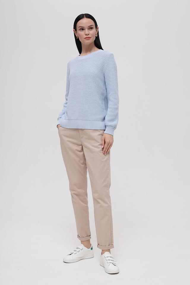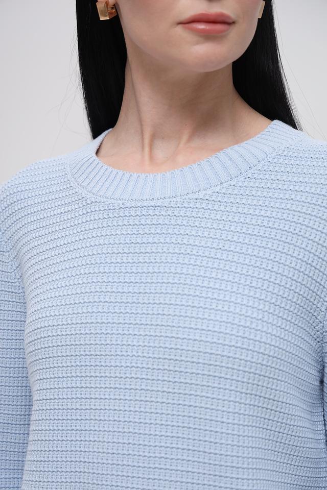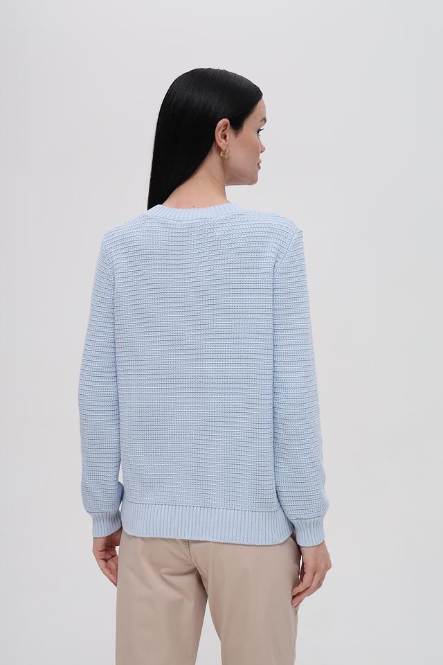 Пуловер имеет голубой цвет и фактурную вязку с рельефным узором, который придает ему особый шарм. Круглый вырез горловины и свободный крой обеспечивают удобную посадку по фигуре.