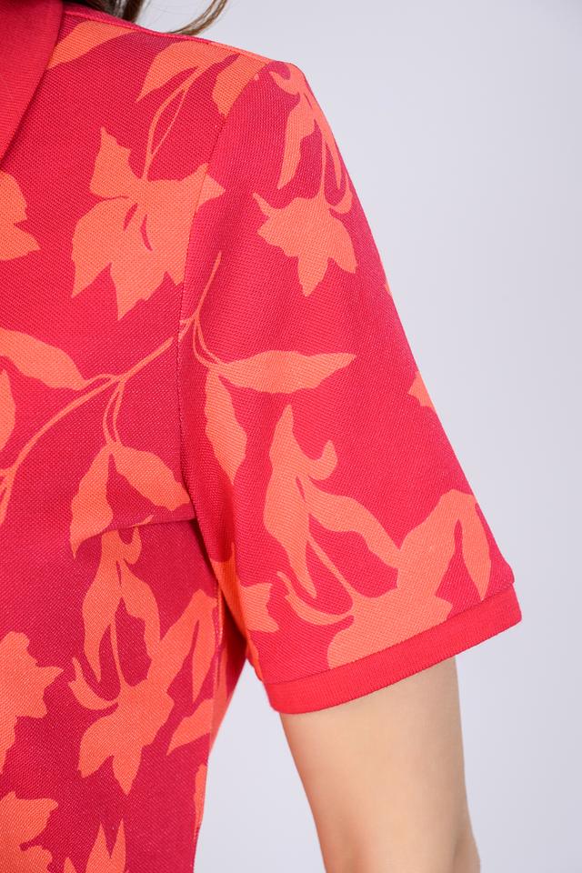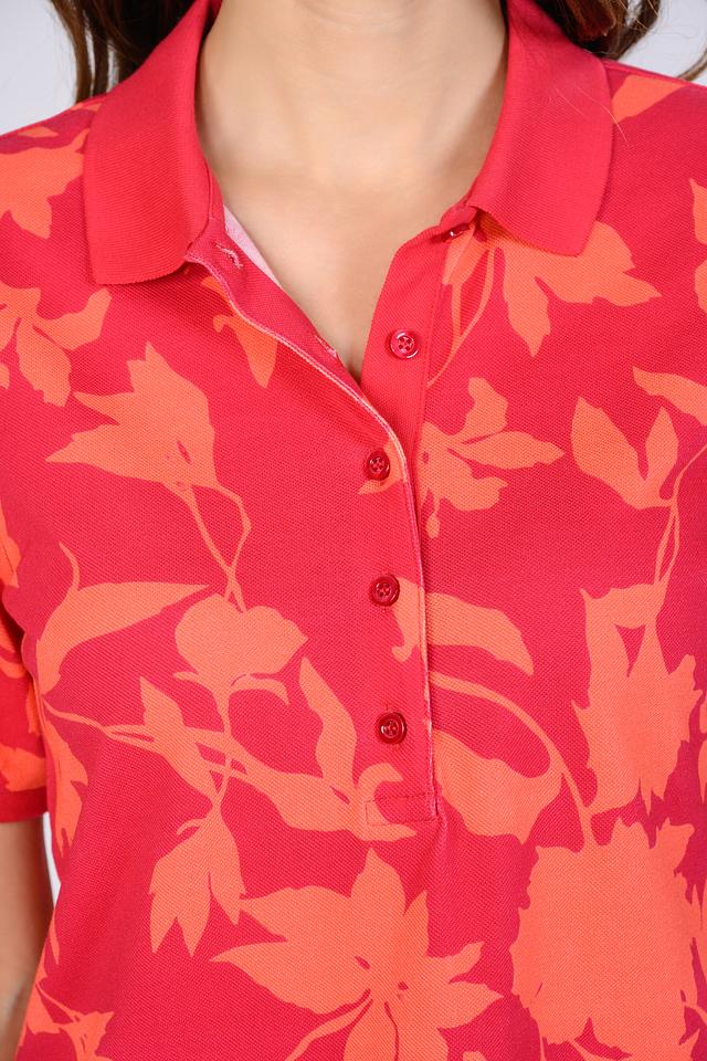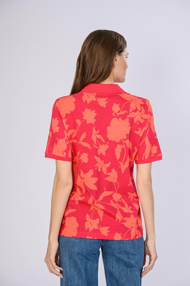 Женская поло Maerz кораллового цвета, декорирована цветочным принтом. Изготовлена из натурального хлопка, обеспечивающего комфорт и воздухопроницаемость. Классический крой и аккуратный воротник-поло делают эту модель универсальной для создания повседневных образов. Состав: хлопок 100%