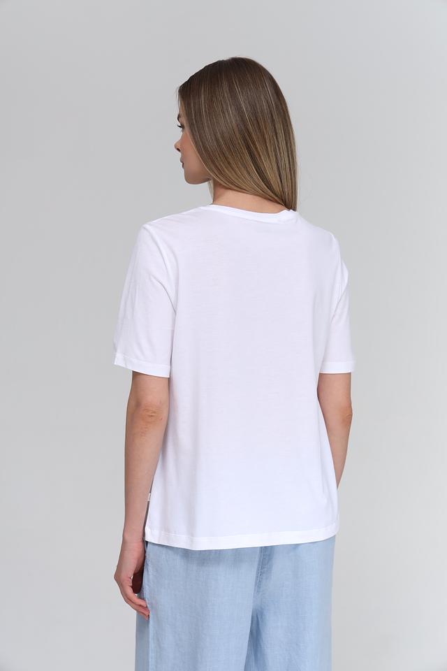 Футболка имеет классический прямой крой, короткие рукава и круглый вырез горловины. Она идеально сочетается с джинсами, шортами, юбками и другими элементами одежды. Состав ткани: 50% хлопок, 50% модал.