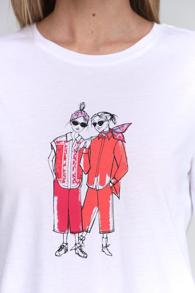 Особенностью данной модели является оригинальный принт с изображением двух стилизованных фигур в красных костюмах. Этот яркий акцент придаёт футболке индивидуальность и делает её отличным выбором для создания повседневных образов.