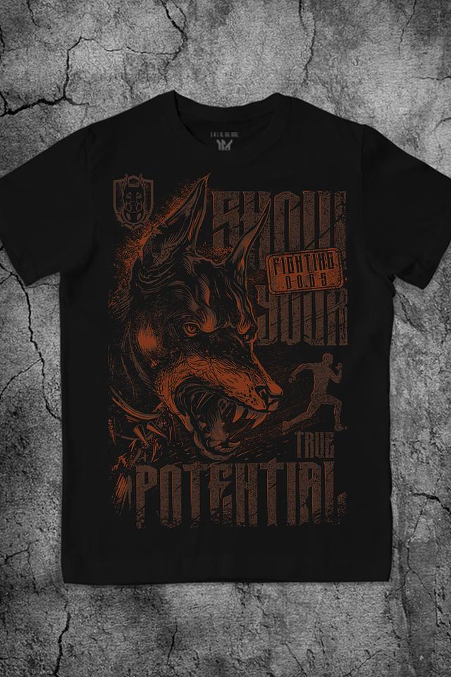 Основным акцентом является яркий графический принт с изображением добермана и мотивирующей надписью. Принт выполнен в оранжево-коричневой гамме, что создает контрастный и запоминающийся образ.