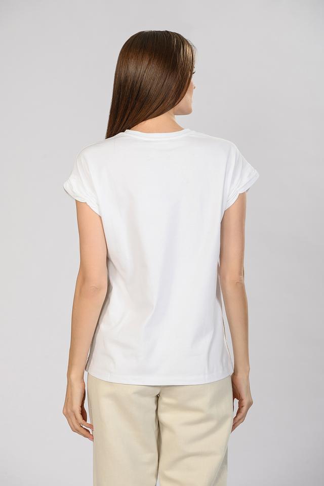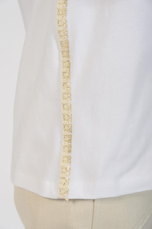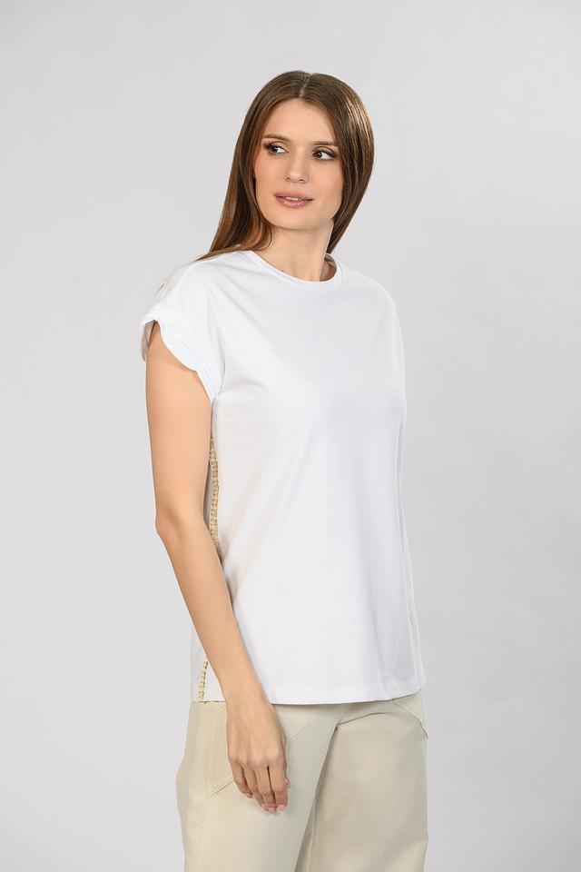 Декоративная отделка по переду добавляет изысканности и делает эту футболку особенной. Она идеально подходит для создания повседневных образов, а также для более нарядных выходов.