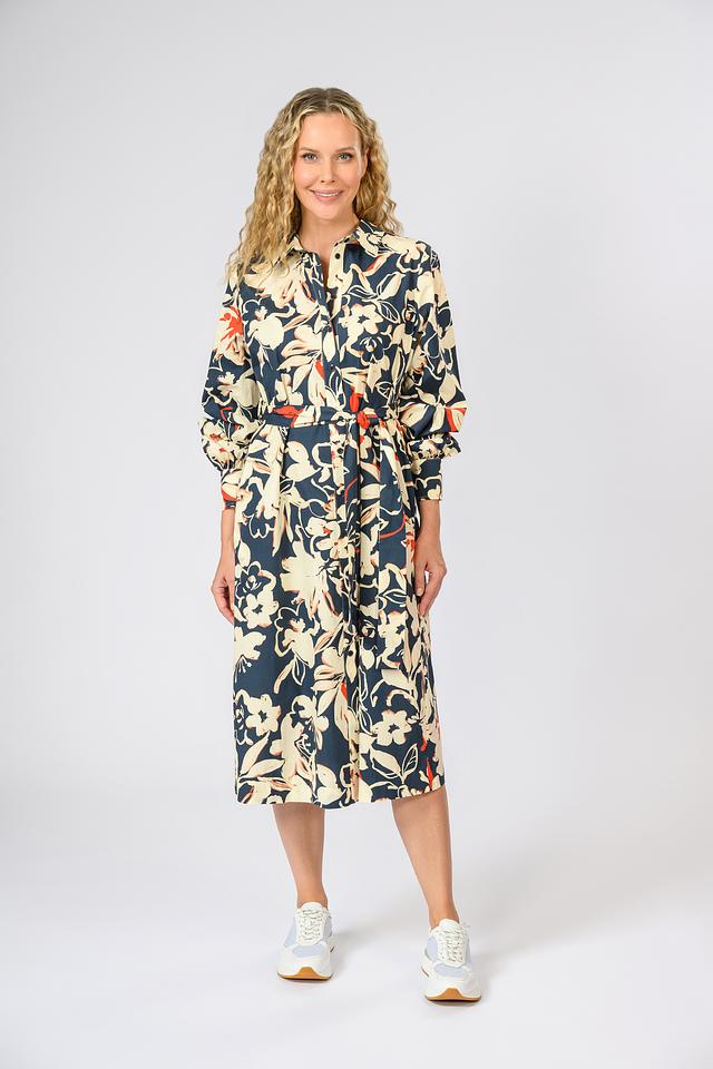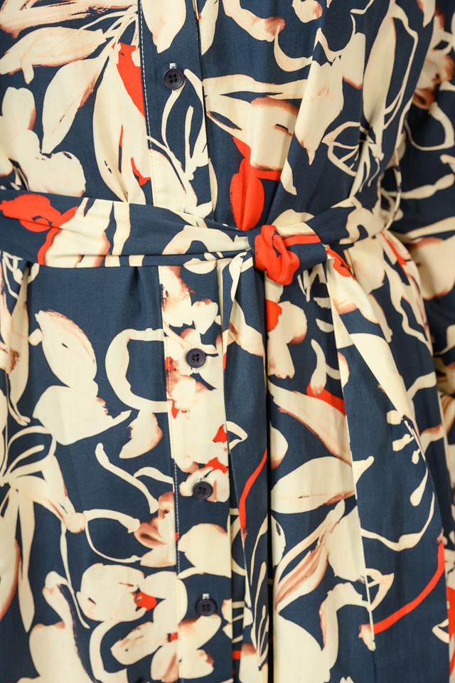 Платье от Malej темно-синего цвета с ярким цветочным принтом – идеальный выбор для создания стильного и комфортного образа. Модель с рукавами 3/4 и поясом подчеркивает талию и придает фигуре женственность. Состав: хлопок 100%