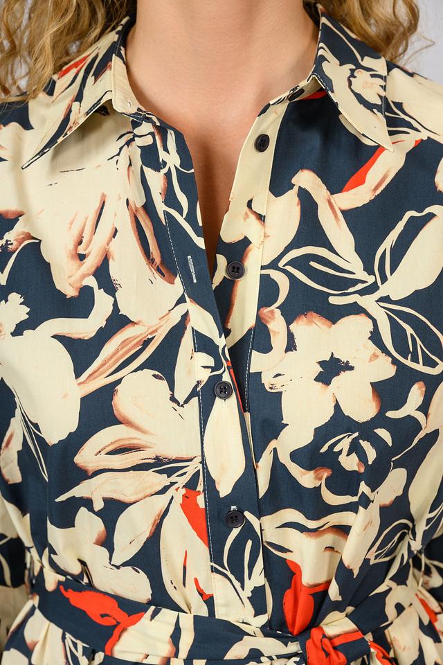 Яркий цветочный принт в бежевых, оранжевых и белых тонах делает это платье отличным выбором для летнего гардероба. Пояс в тон платья позволяет подчеркнуть талию и создать более женственный силуэт. Платье идеально подойдет для повседневной носки, а также для особых случаев.