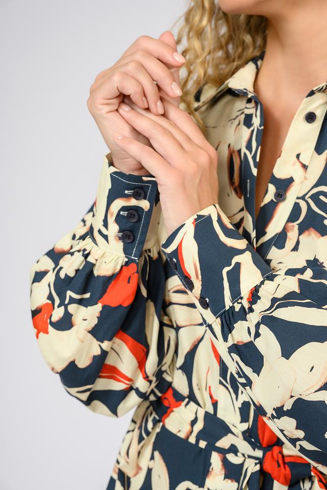 Платье имеет приталенный силуэт, который подчеркивает достоинства фигуры. Застежка на пуговицах по всей длине платья позволяет регулировать степень открытия. Рукава 3/4 с манжетами на пуговицах добавляют образу изысканности.