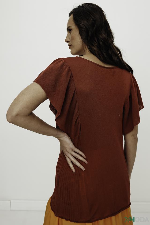 Женский джемпер Manila Grace терракотового цвета с короткими рукавами и воланами. Модель выполнена из 100% хлопка, имеет оригинальный крой с акцентом на рукавах и талии. Состав: хлопок 100%