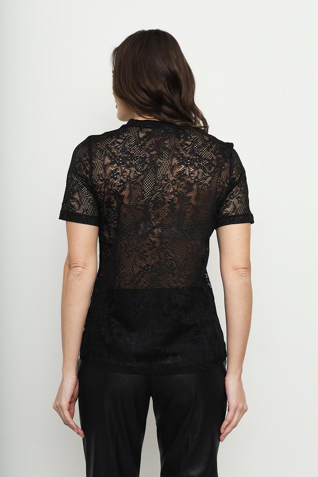Модель имеет короткие рукава и круглый вырез горловины. Кружевной материал обеспечивает легкость и воздухопроницаемость, а добавление эластана в состав ткани (95% полиэстер, 5% эластан) гарантирует комфортную посадку по фигуре и сохранение формы после стирки.