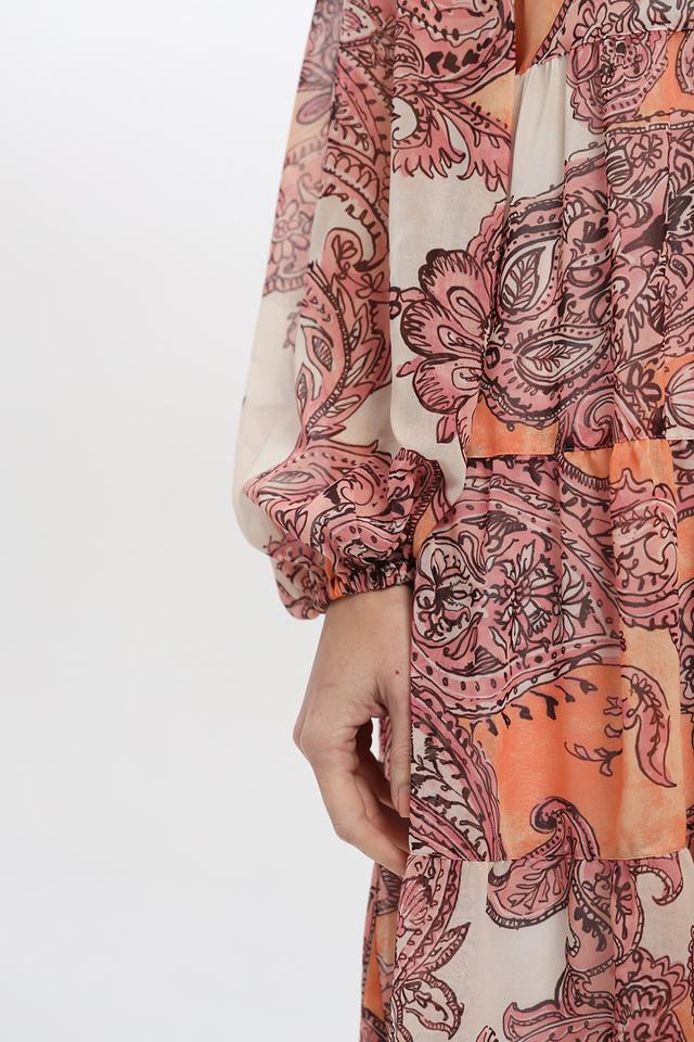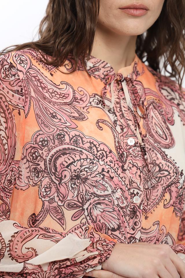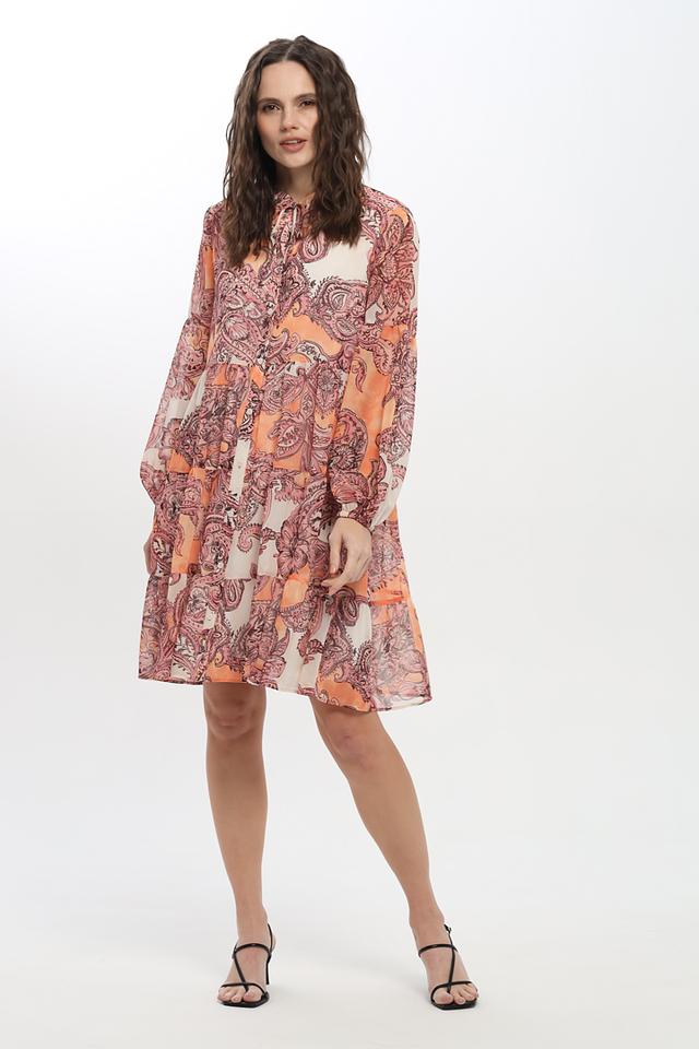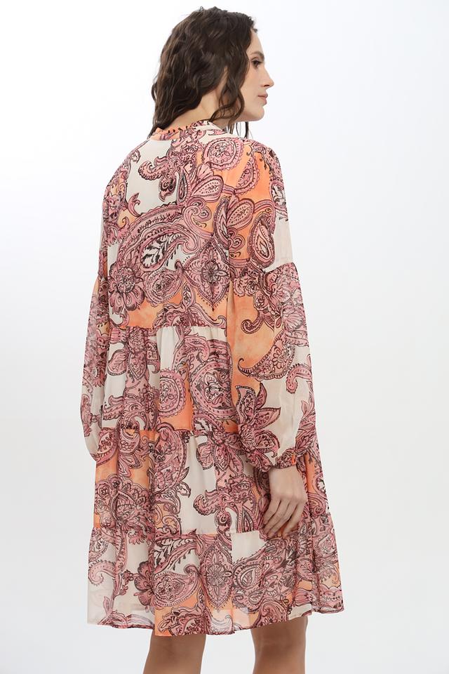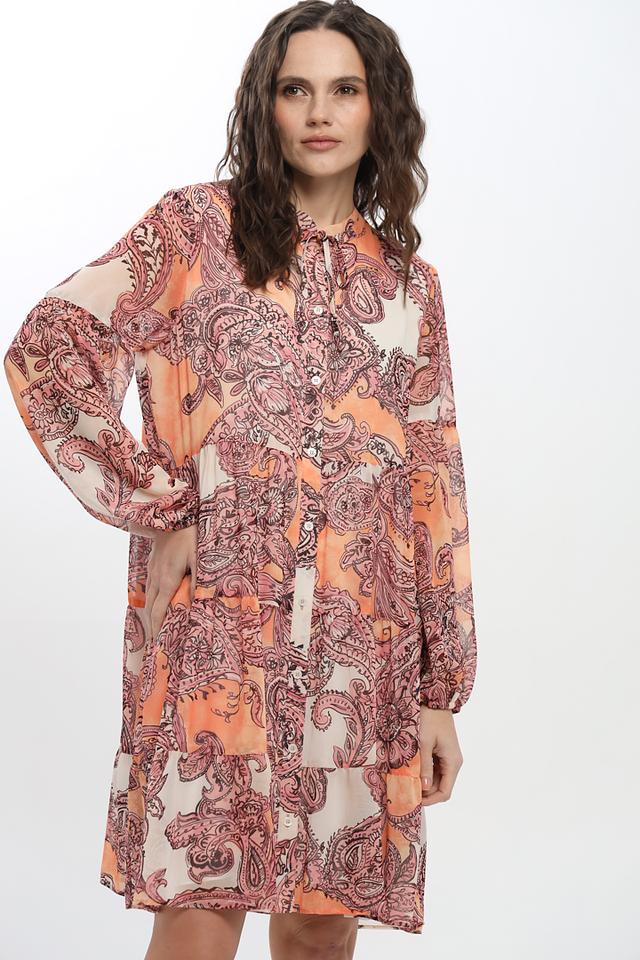 Короткое платье Marc Aurel оранжево-бежевого цвета с ярким принтом пейсли. Изготовлено из 100% полиэстера, имеет длинные рукава и свободный крой, идеально подходит для создания стильного и комфортного образа. Состав: полиэстер 100%