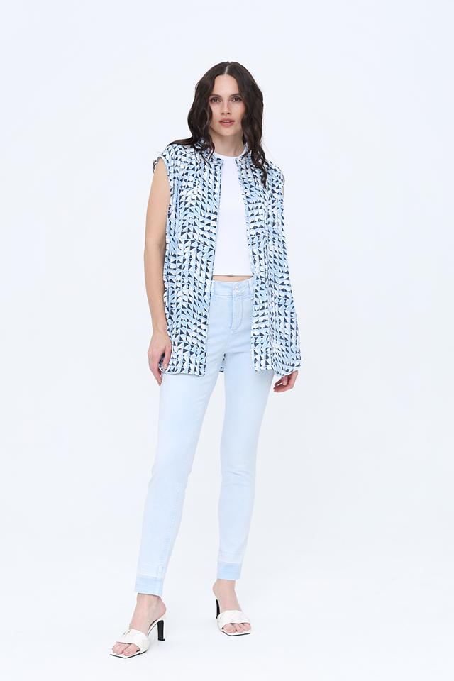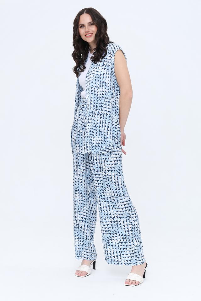 Особенностью данной модели является яркий геометрический принт в голубых и тёмно-синих тонах, который придаёт образу оригинальность и свежесть.