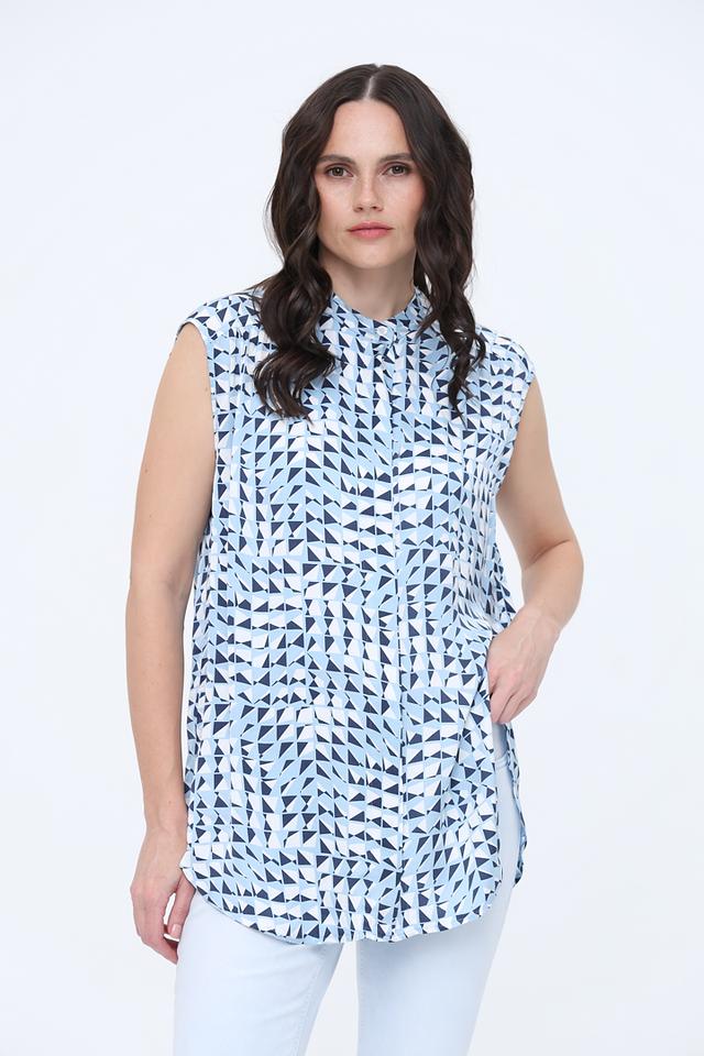 Топ Marc Aurel голубого цвета с оригинальным геометрическим принтом станет стильным дополнением вашего гардероба. Модель без рукавов выполнена из 100% вискозы, что обеспечивает комфорт и лёгкость в носке. Состав: вискоза 100%