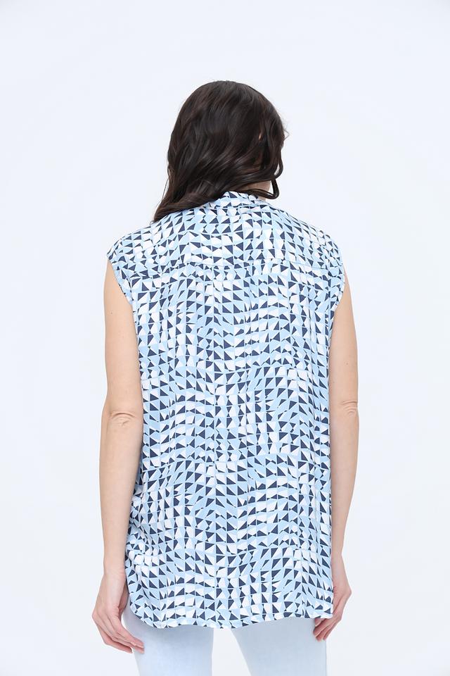 Воротник рубашечного типа добавляет элегантности, а отсутствие рукавов делает топ идеальным для тёплой погоды.