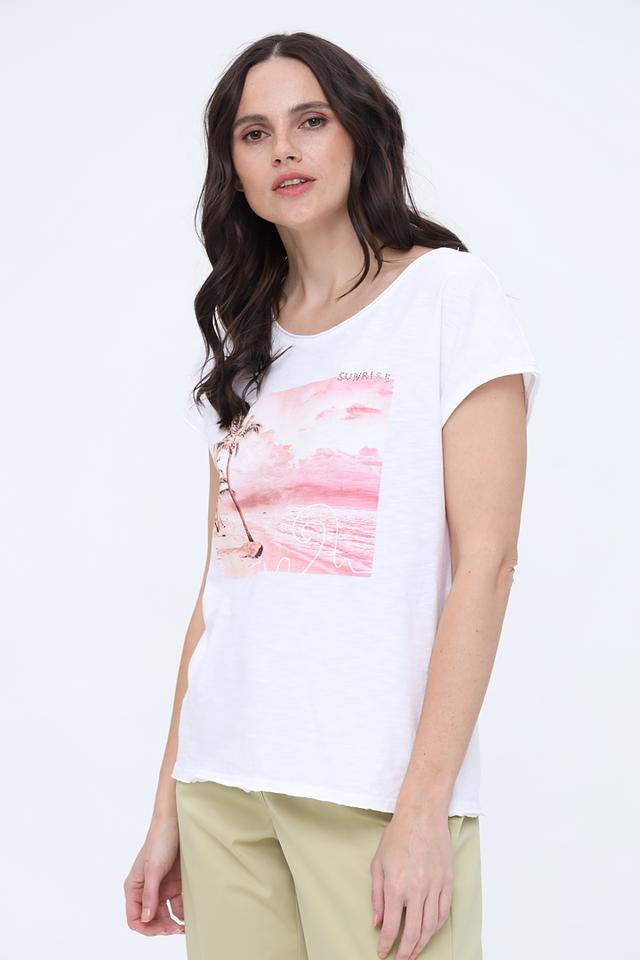 Основной цвет футболки – белый, который служит идеальным фоном для яркого и красочного принта с изображением тропического пейзажа: пальм, закатного неба и морской волны.