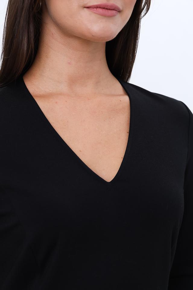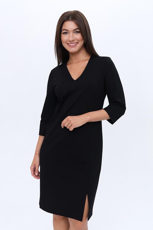 V-образный вырез горловины визуально удлиняет шею и делает образ более женственным. Рукава длиной 3/4 добавляют платью элегантности. Сзади платье имеет небольшой разрез, который придает ему динамичность и кокетливость.