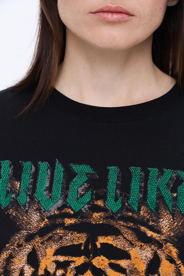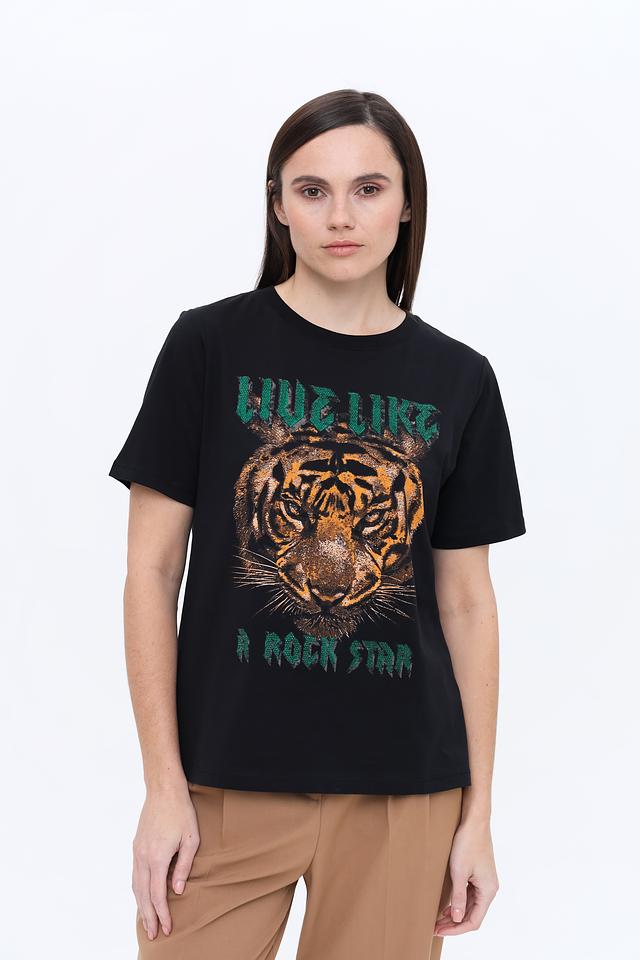 Эта футболка от Marc Aurel – идеальное сочетание стиля и комфорта. Выполнена в классическом чёрном цвете, украшена эффектным принтом с изображением тигра, выполненным в зелёных и золотистых тонах.