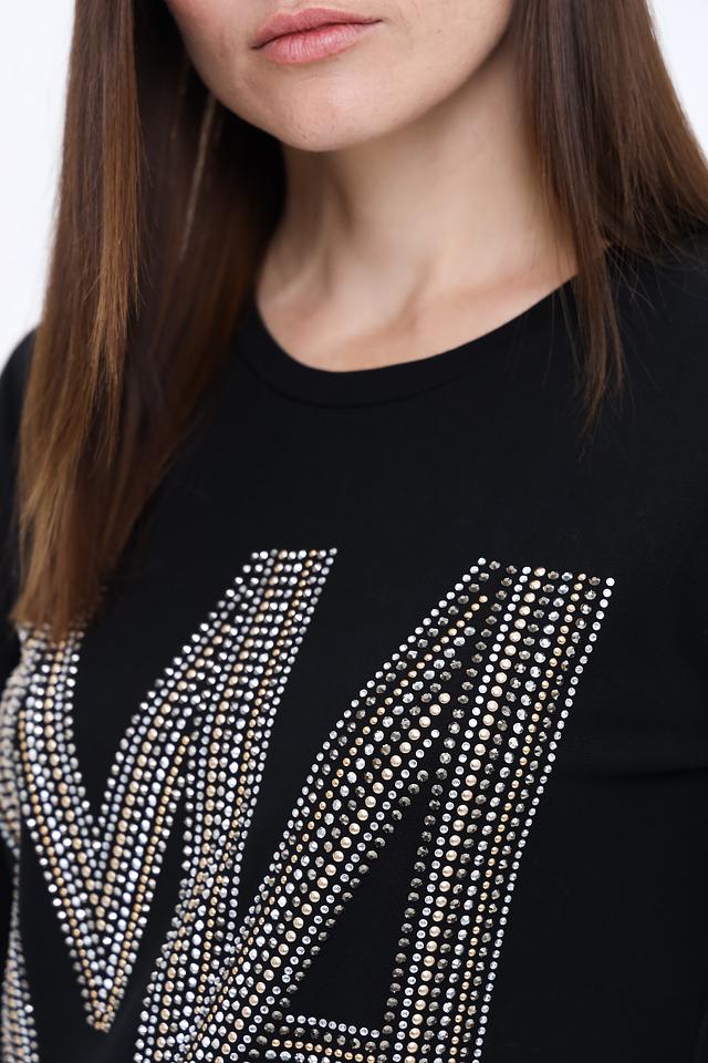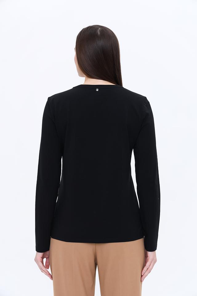 Особенностью модели является декоративный логотип бренда, выполненный из мерцающих страз, что придает изделию изысканность и привлекательность. Лонгслив имеет прямой крой и удобную длину рукава.