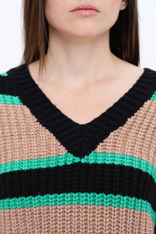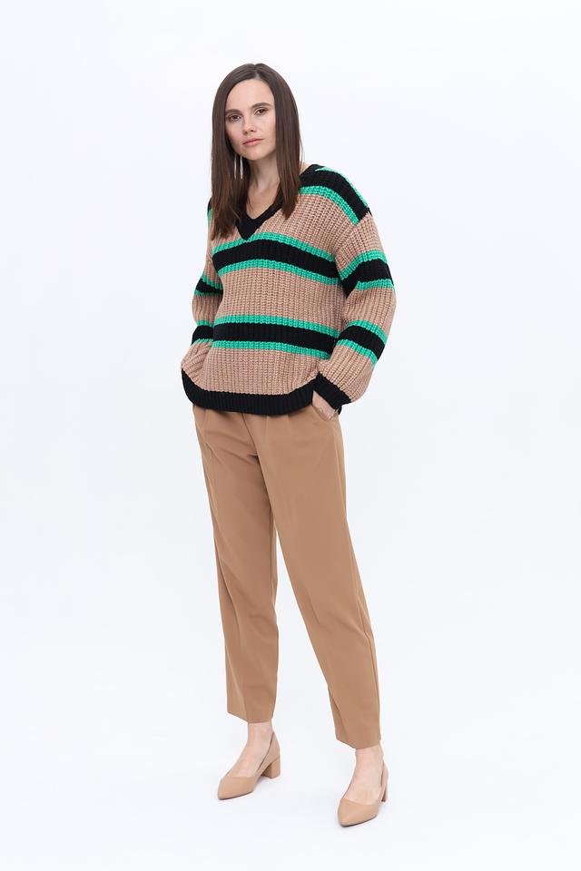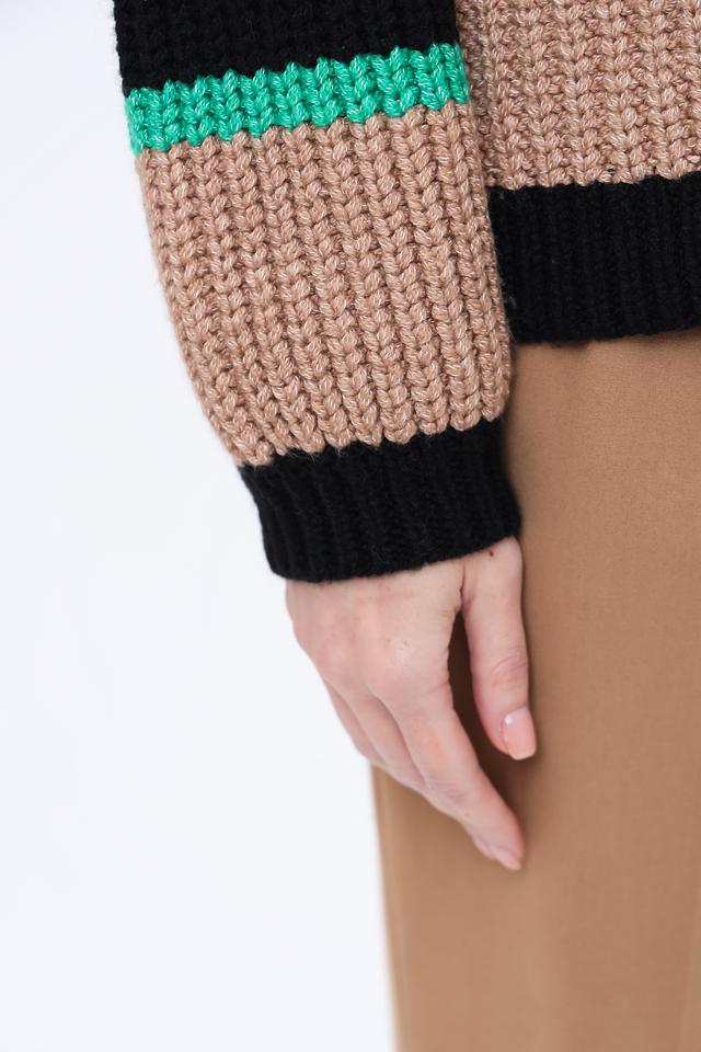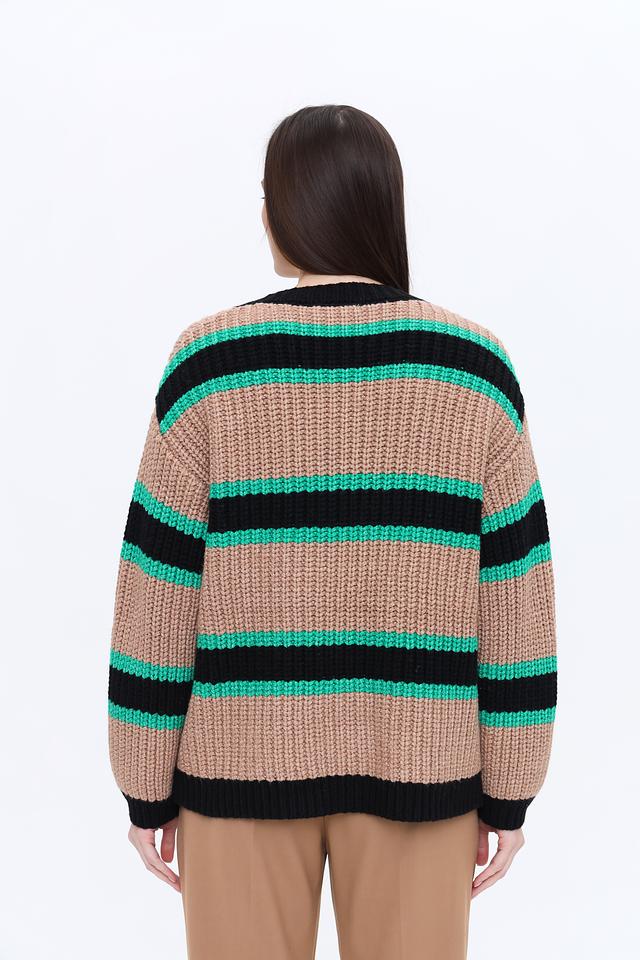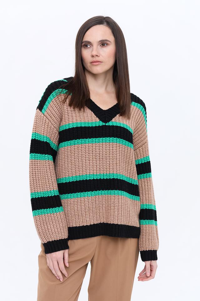 Этот пуловер от Marc Aurel станет отличным дополнением к вашему образу. Он выполнен в бежевом цвете с контрастными полосками чёрного и зелёного оттенков, создавая яркий и запоминающийся вид.