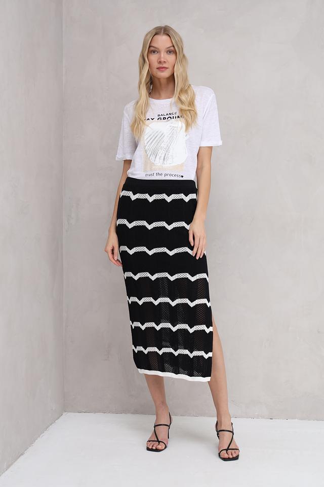 Особенностью данной модели является яркий принт на лицевой стороне, изображающий раковину и надписи на английском языке. Принт выполнен в чёрно-белой гамме, что добавляет контрастности и выразительности образу. Круглый вырез горловины и короткие рукава делают футболку универсальной и подходящей для повседневной носки.