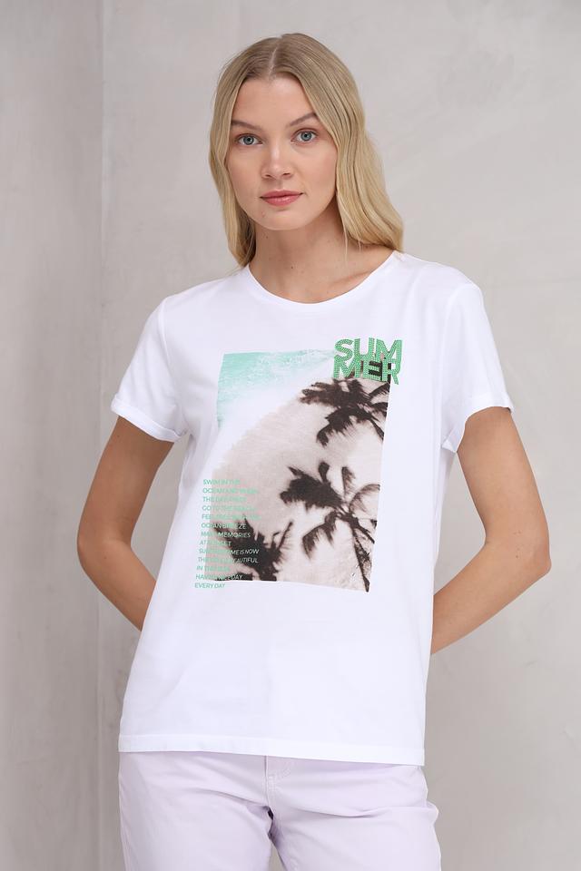 Футболка имеет прямой крой и короткие рукава, что обеспечивает свободу движений и комфорт в жаркую погоду. Главной особенностью модели является яркий принт с изображением пальм и надписью "SUMMER", который придает ей летнее настроение.