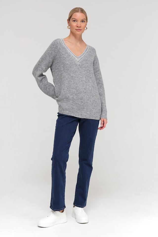 Пуловер имеет V-образный вырез, который визуально удлиняет шею и придает образу элегантность. Свободный крой обеспечивает комфорт и свободу движений, а длинные рукава защищают от прохлады.