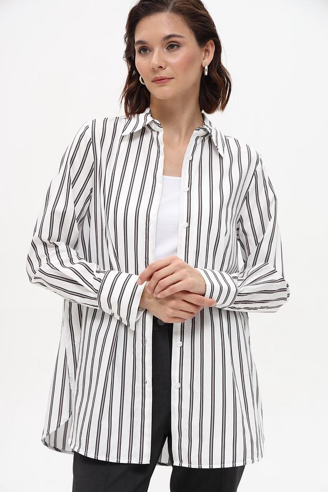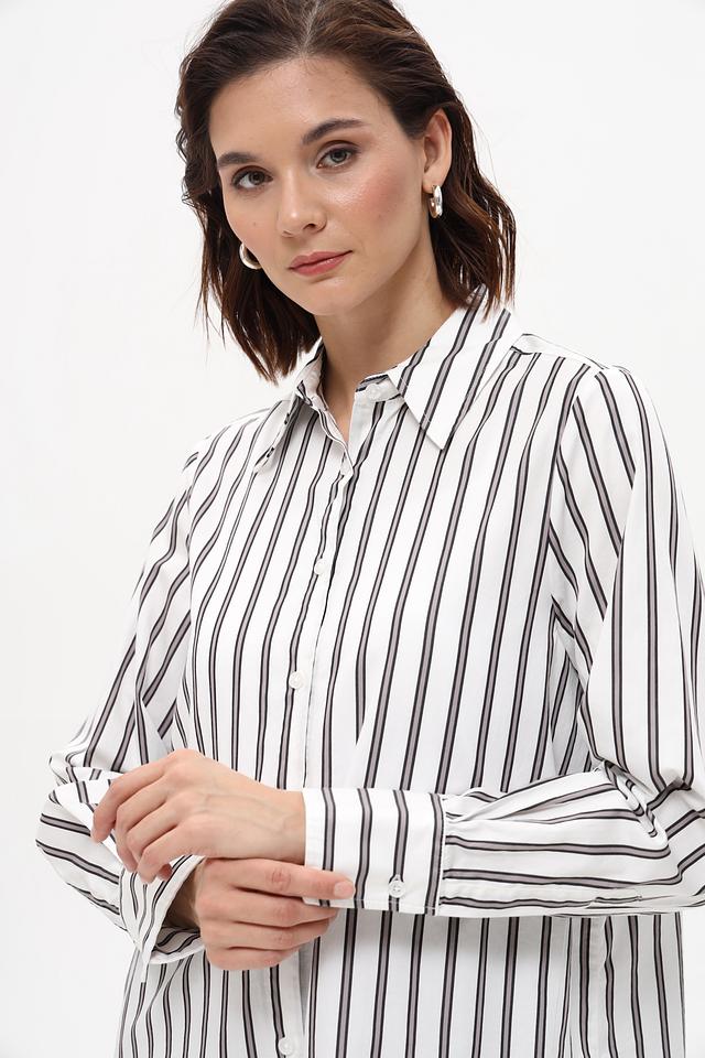 Рубашка имеет прямой, слегка свободный крой, который обеспечивает комфорт в носке. Длинные рукава с манжетами можно зафиксировать или носить распущенными. Классический воротник придает рубашке элегантный вид.