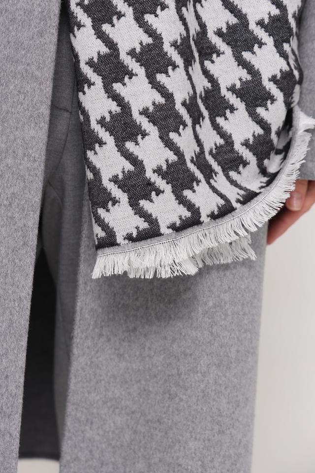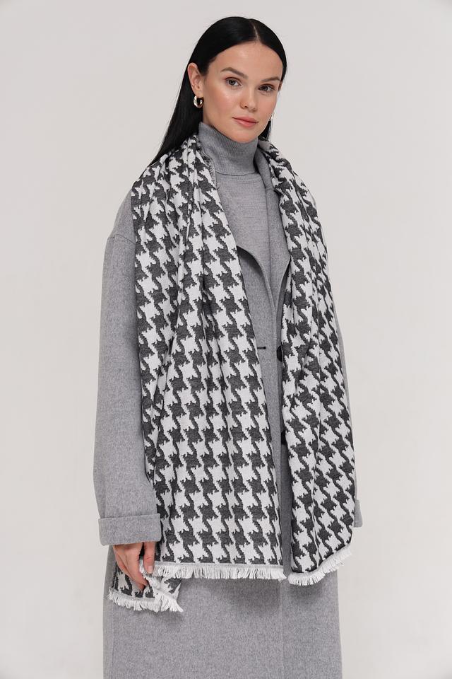 Шарф имеет бахрому по краям, что придает ему дополнительный шарм и завершенность. Его универсальный дизайн позволяет сочетать его с различными видами верхней одежды и повседневной одеждой.