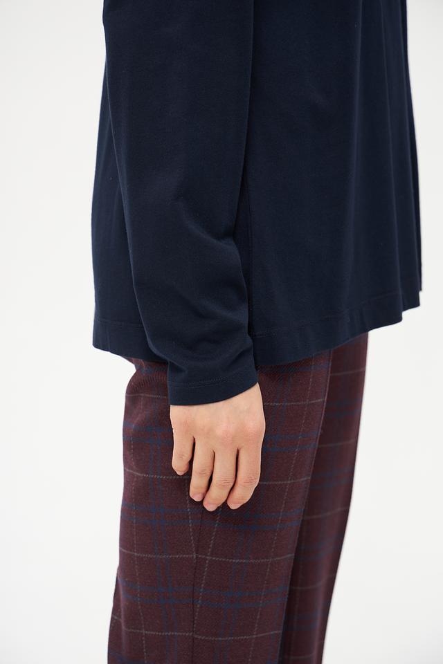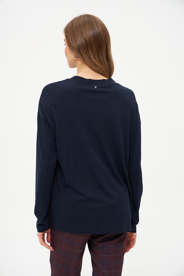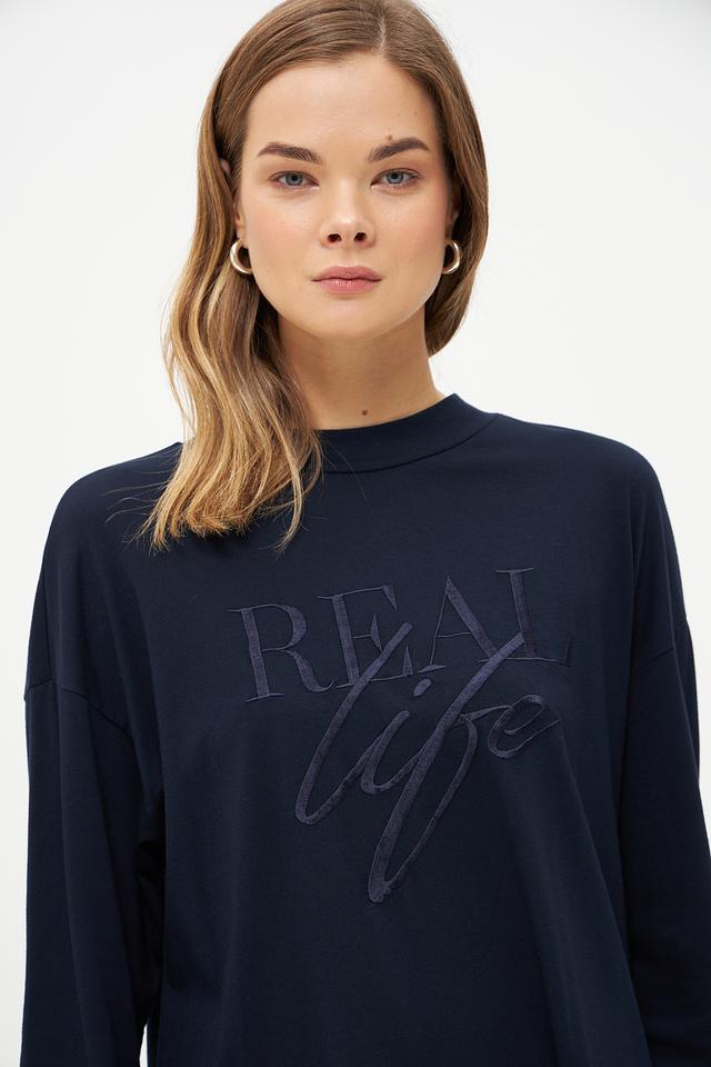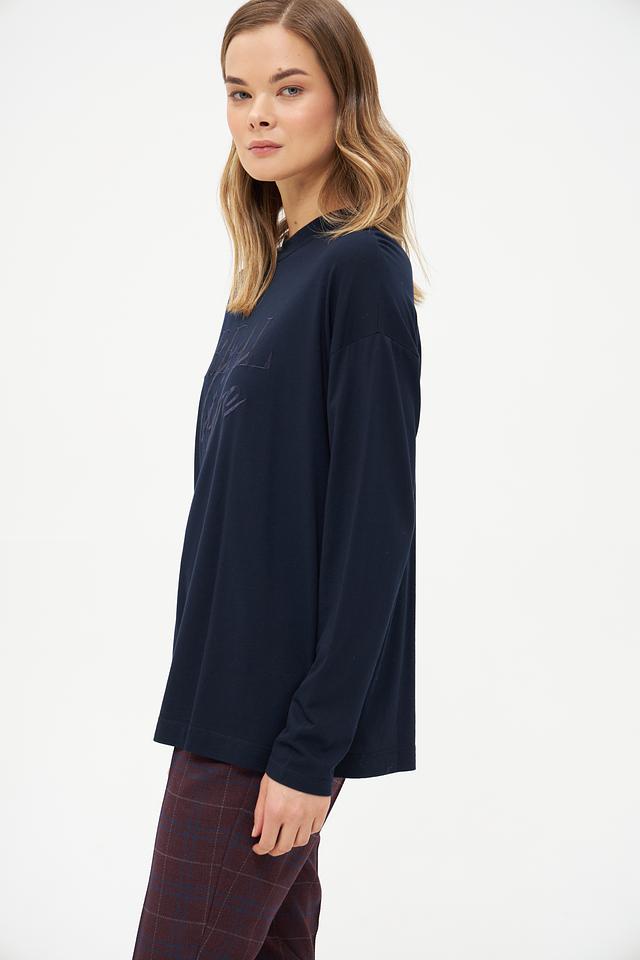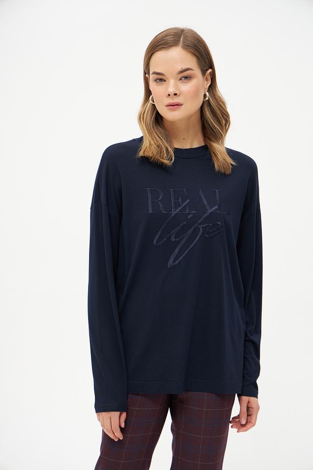 Женская футболка Marc Aurel темно-синего цвета с надписью "REAL life". Модель выполнена из мягкого хлопка с модалом, имеет свободный крой и длинные рукава. Состав: хлопок 50%, модал 50%