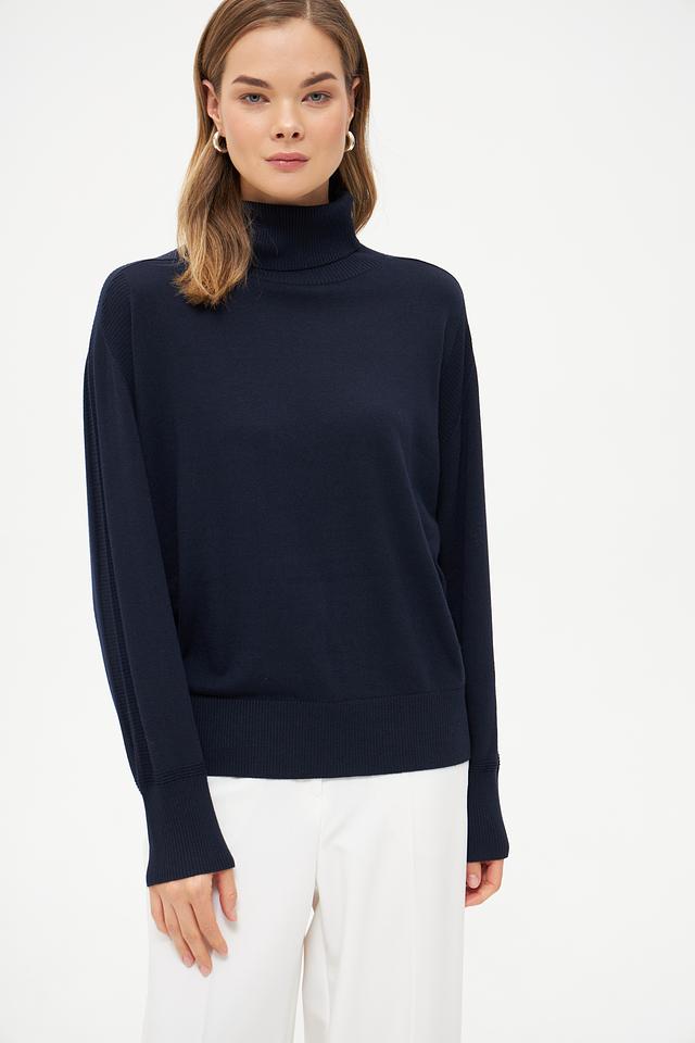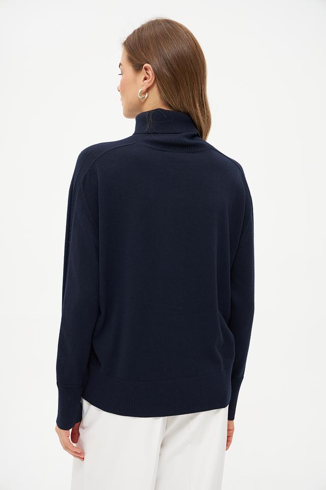 Тёмно-синий цвет делает эту водолазку универсальным элементом гардероба, который легко сочетается с другими вещами. Она идеально подходит для создания как повседневных, так и более формальных образов. Водолазку можно носить самостоятельно или в качестве базового слоя под пиджак или пальто.