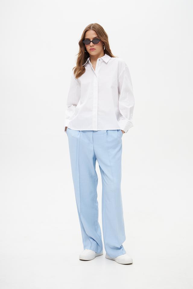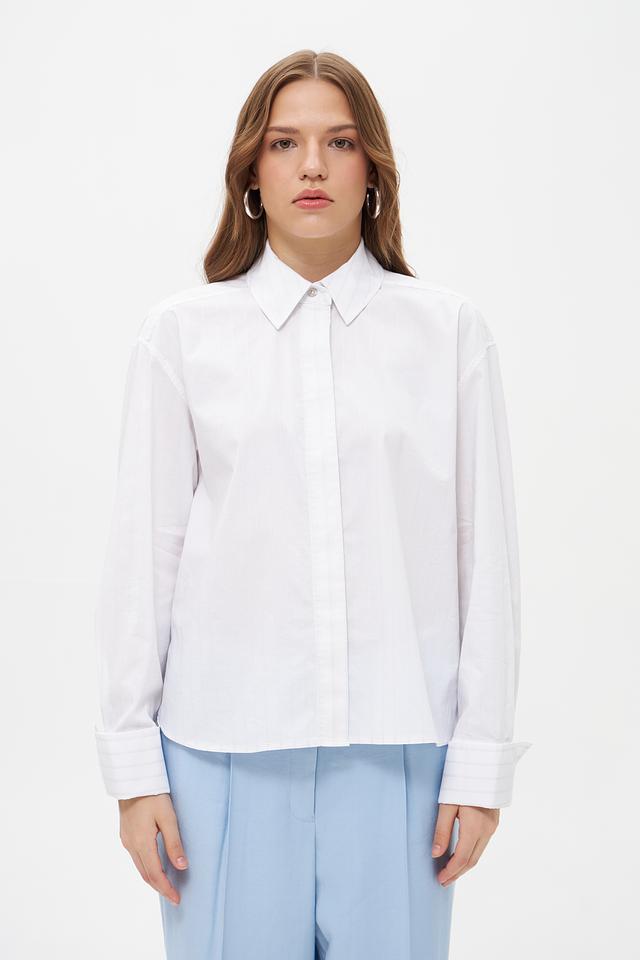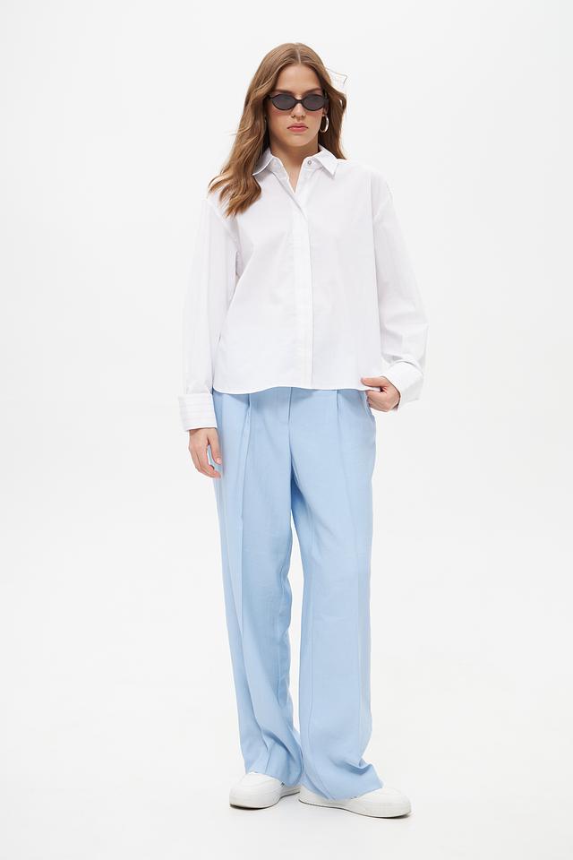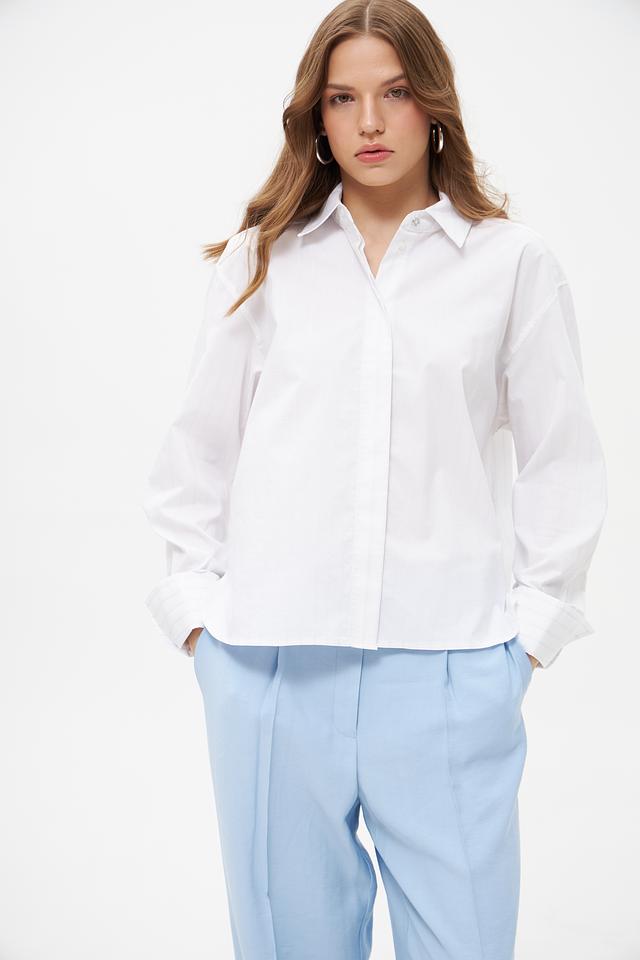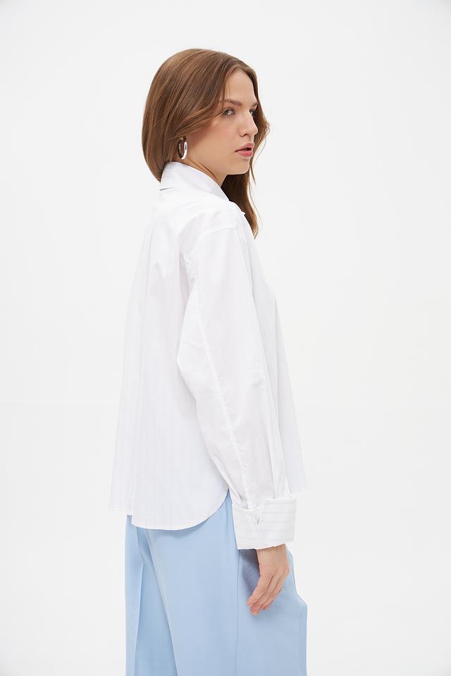 Модель выполнена в свободном оверсайз крое, обеспечивающем комфорт и свободу движений. Классический воротник и длинные рукава с манжетами на пуговицах придают блузке элегантный вид.