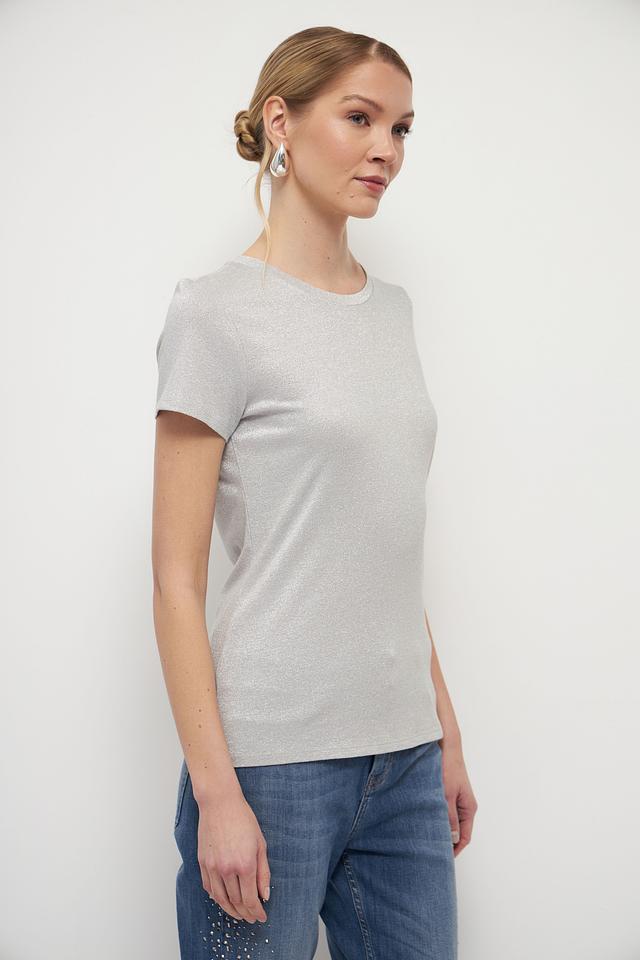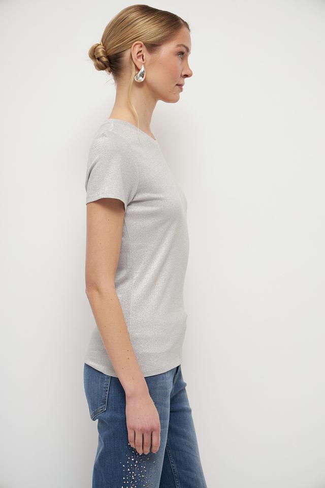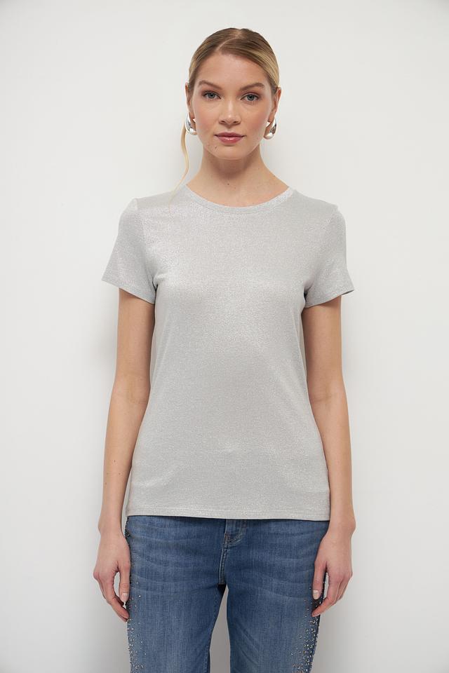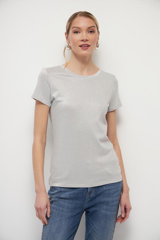 Женская футболка Marc Aurel серебристого цвета с добавлением металлизированной нити. Изготовлена из мягкой вискозы, обеспечивающей комфорт и приятные ощущения при носке. Стильный и элегантный вариант для создания повседневных образов. Состав: вискоза 65%, метализ.нить 35%