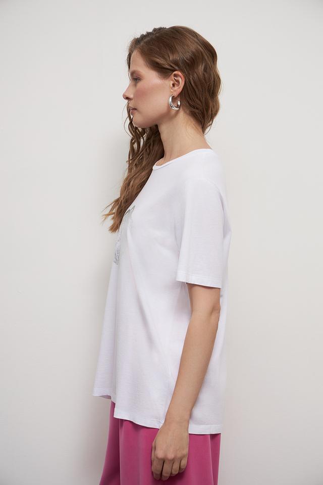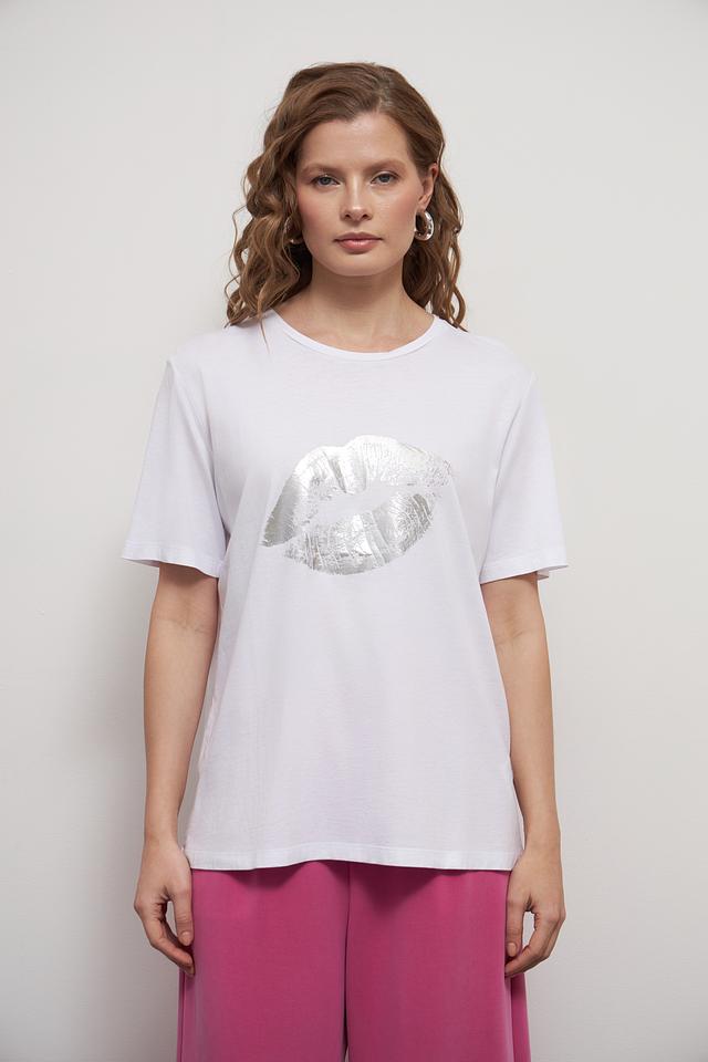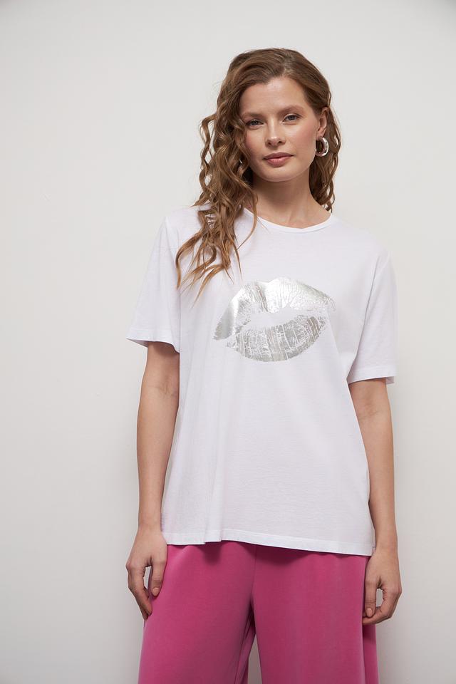 Основным акцентом футболки является яркий принт в виде женских губ, выполненный в серебристых тонах. Этот элемент дизайна придает образу игривость и индивидуальность.