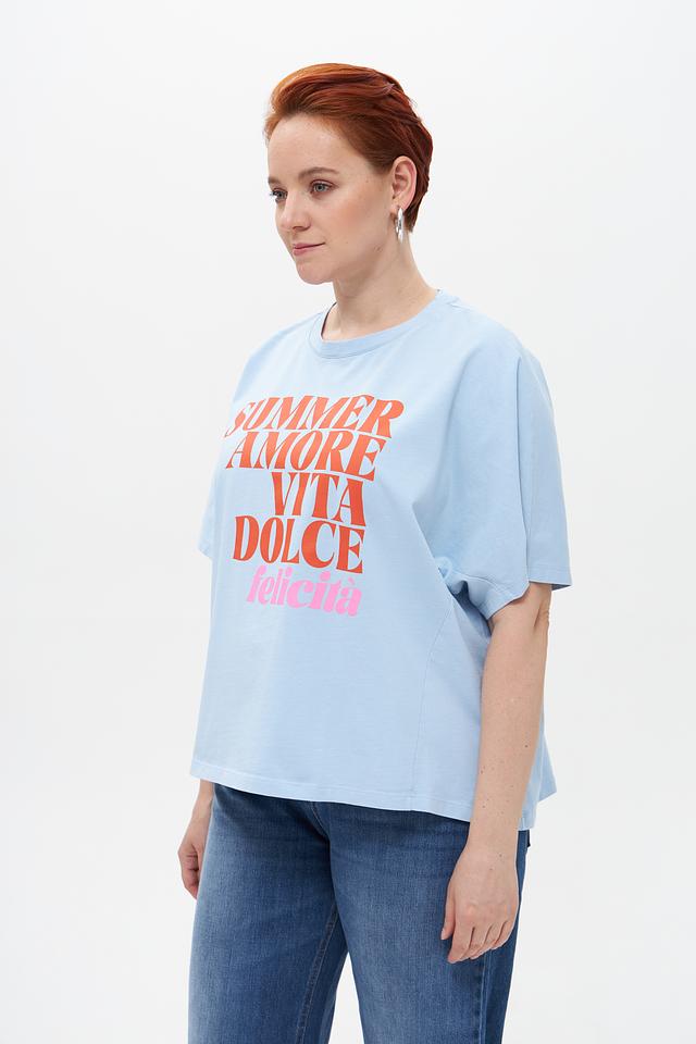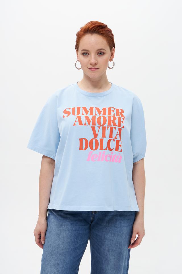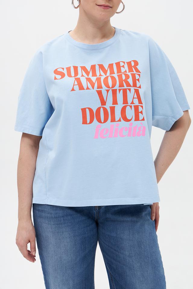 Основным акцентом этой модели является яркий принт с надписями “SUMMER AMORE VITA DOLCE felicita”, выполненный в розовых и коричневых тонах. На задней части футболки расположен небольшой принт “XOXO”. Такой дизайн добавит игривости и индивидуальности вашему образу.
