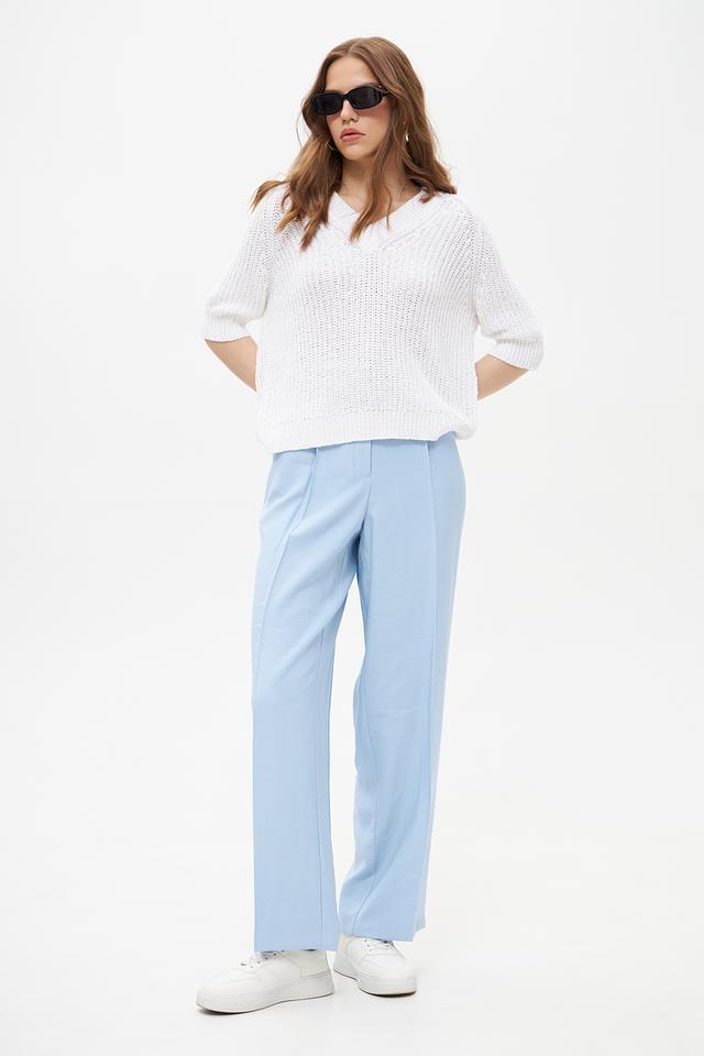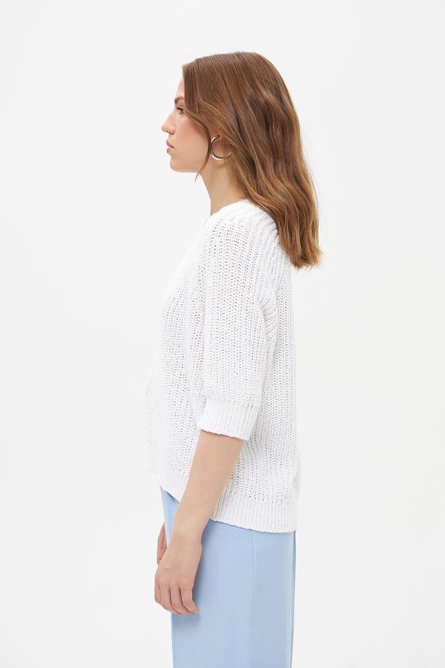 Пуловер отличается лёгкой, воздушной текстурой благодаря особому плетению. Короткие рукава делают его идеальным выбором для тёплой погоды или для создания многослойных образов. Белый цвет пуловера легко сочетается с любой одеждой и аксессуарами.
