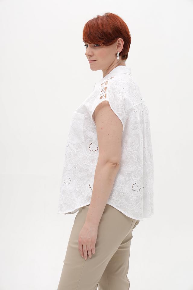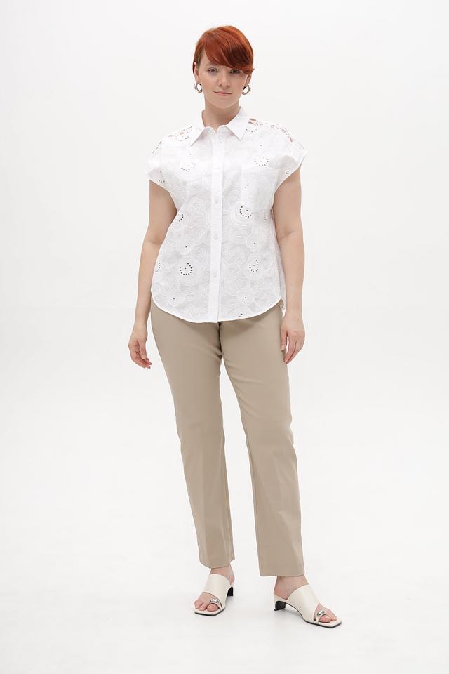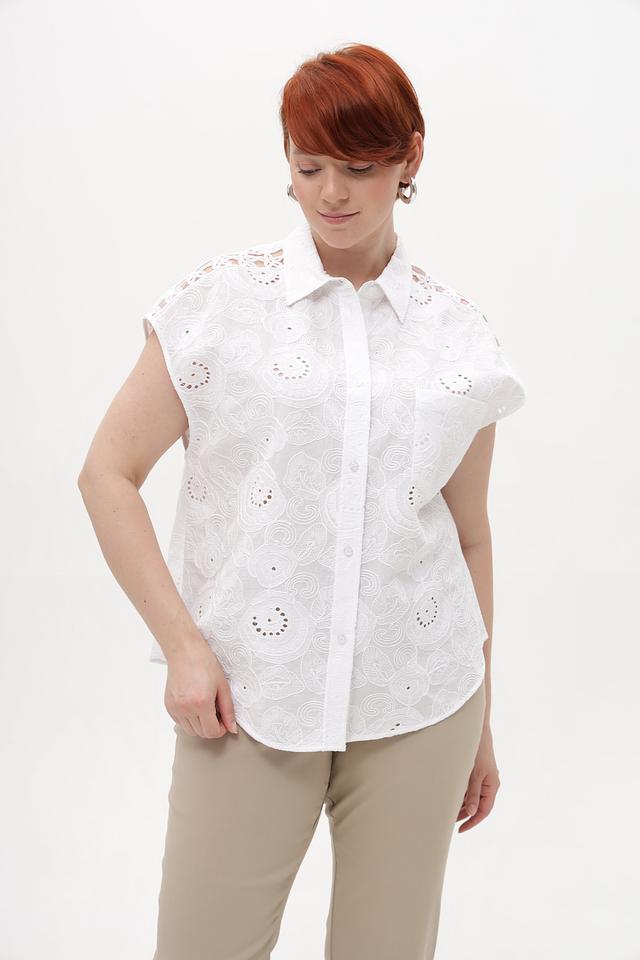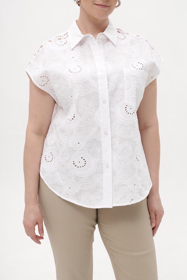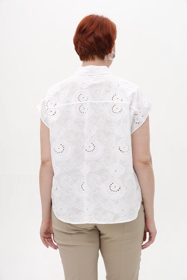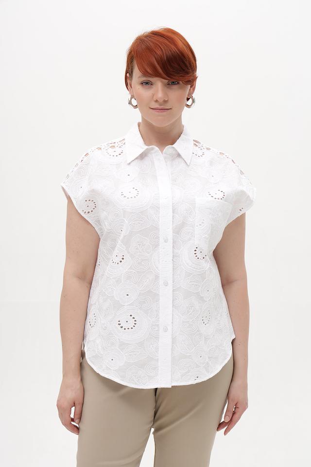 Модель выполнена в белом цвете и украшена изысканным цветочным узором, выполненным в технике вышивки. Классический крой с короткими рукавами и отложным воротником делает эту блузку универсальной для различных образов.