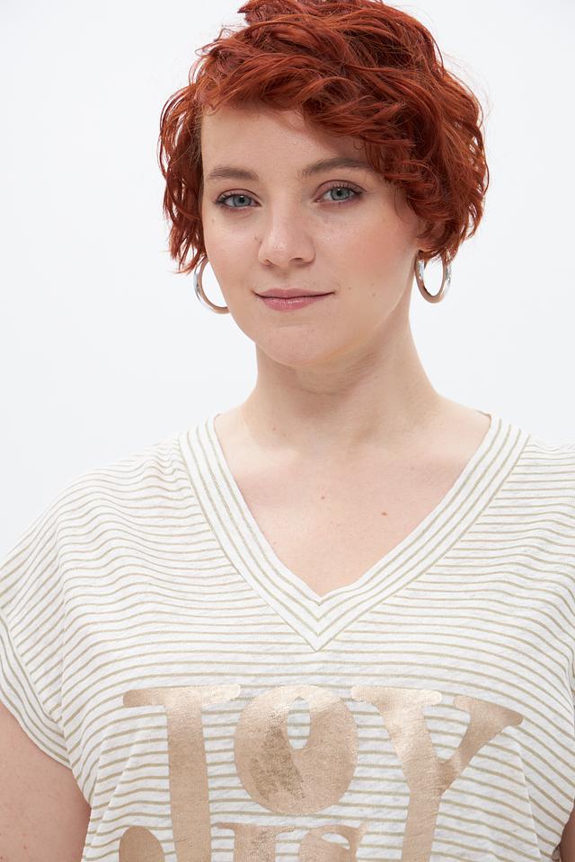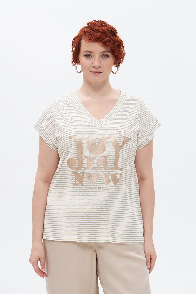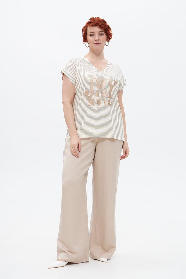 Передняя часть футболки украшена крупной золотистой надписью, добавляющей образу изысканности и стиля. V-образный вырез горловины и укороченные рукава делают силуэт более легким и женственным.