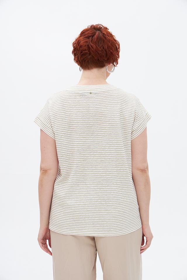 Бежевая футболка Marc Aurel с полосатым принтом и золотистой надписью. Изготовлена из натурального льна с добавлением хлопка, обеспечивающего комфорт и воздухопроницаемость. Состав: лен 70%, хлопок 30%