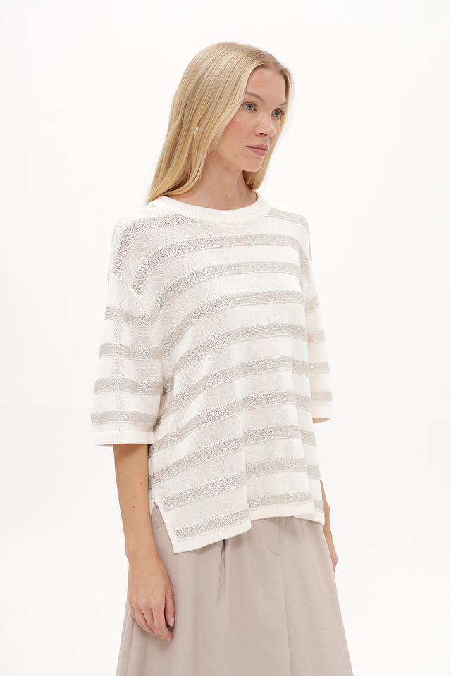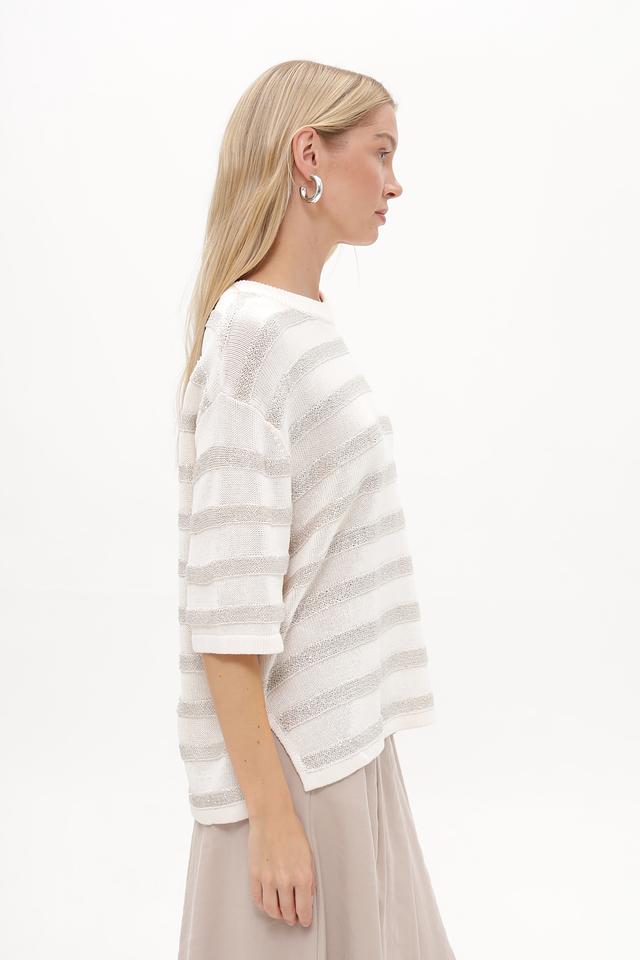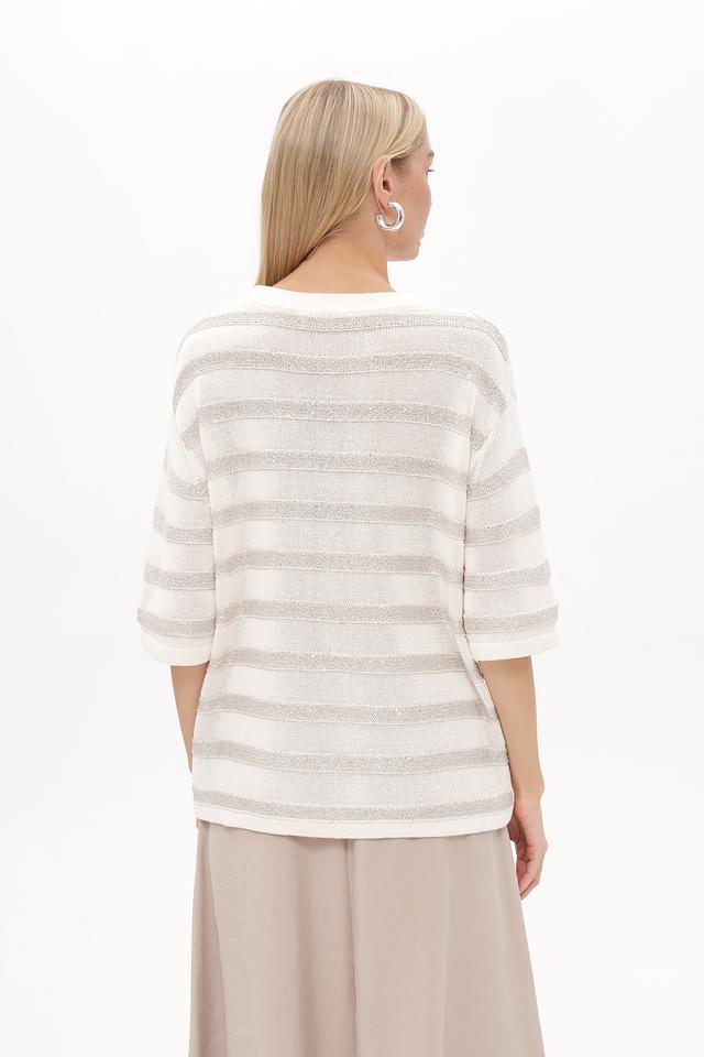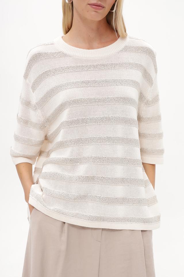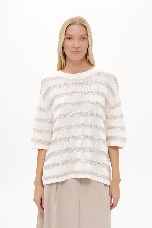 Модель имеет удобный крой с короткими рукавами и круглым вырезом горловины. Пуловер изготовлен из высококачественного трикотажа, в составе которого преобладает хлопок (61%), что обеспечивает комфорт и воздухопроницаемость. Добавление полиэстера (24%) и полиакрила (15%) придает изделию прочность и устойчивость к деформации.
