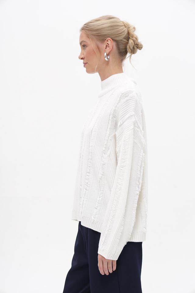 Пуловер имеет свободный крой, который обеспечивает комфорт и свободу движений. Выразительный узор из кос добавляет изделию текстуру и визуальный интерес. Высокий воротник-стойка делает модель более универсальной и позволяет сочетать ее с различными аксессуарами.