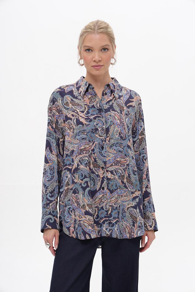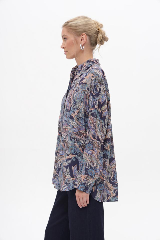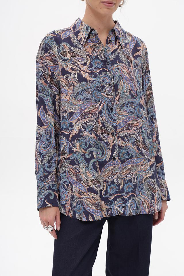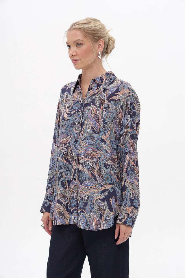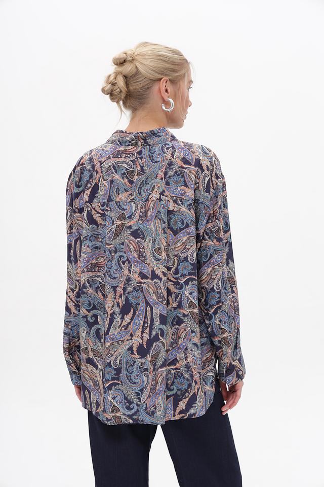 Блуза имеет классический крой с длинными рукавами и воротником рубашечного типа. Особенностью модели является яркий и стильный принт пейсли, выполненный в синих, бежевых и коричневых тонах.