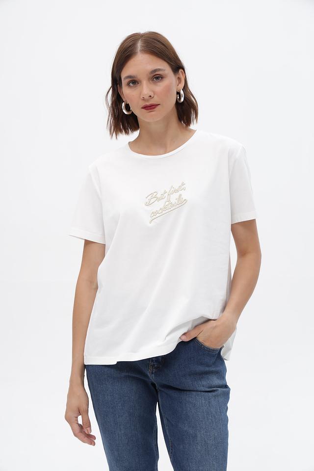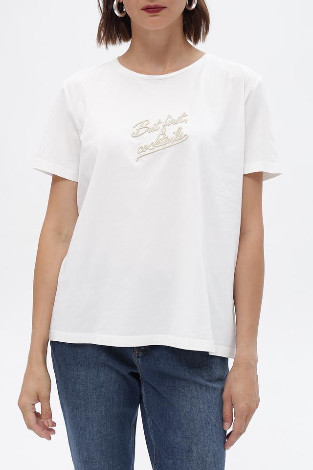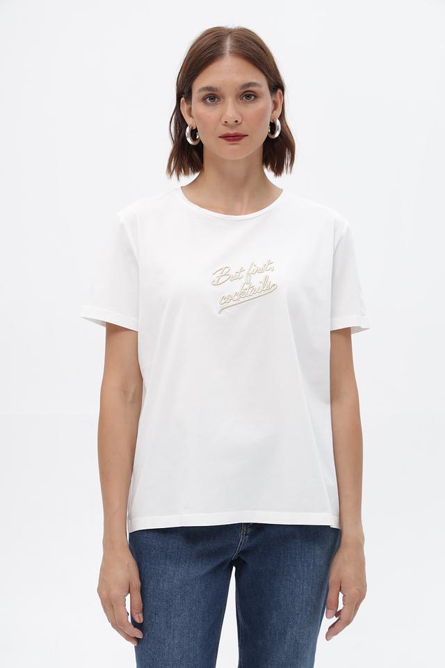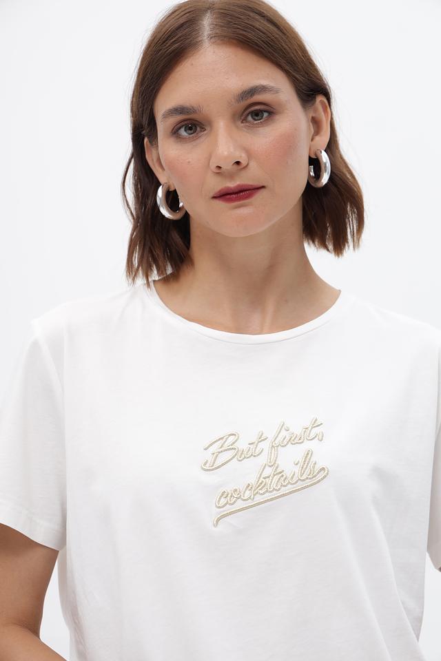 Передняя часть футболки украшена вышивкой золотистого цвета с надписью “But first cocktails”. Вышивка придает изделию оригинальность и акцентный вид.