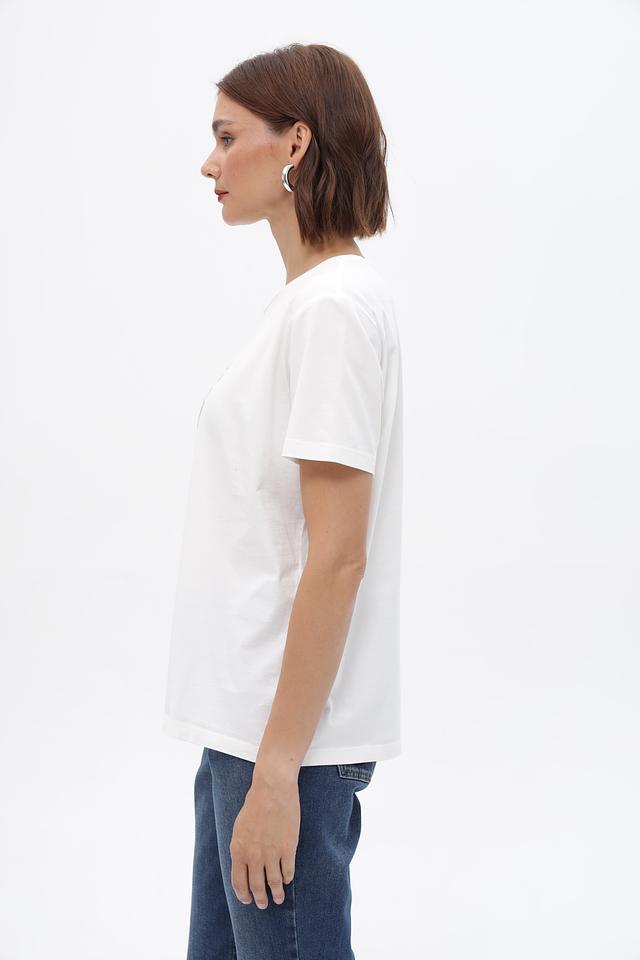 Футболка изготовлена из 100% хлопка, что обеспечивает комфорт при носке и приятные тактильные ощущения. Эта модель станет отличным дополнением к вашему повседневному гардеробу и легко сочетается с джинсами, брюками или юбками.