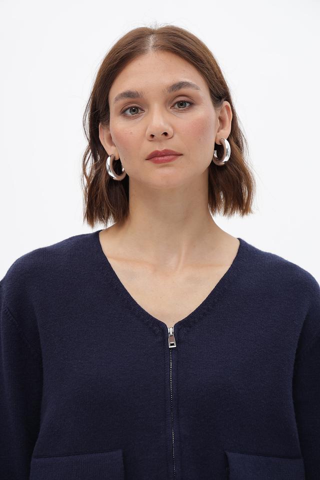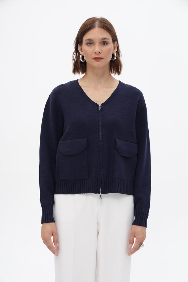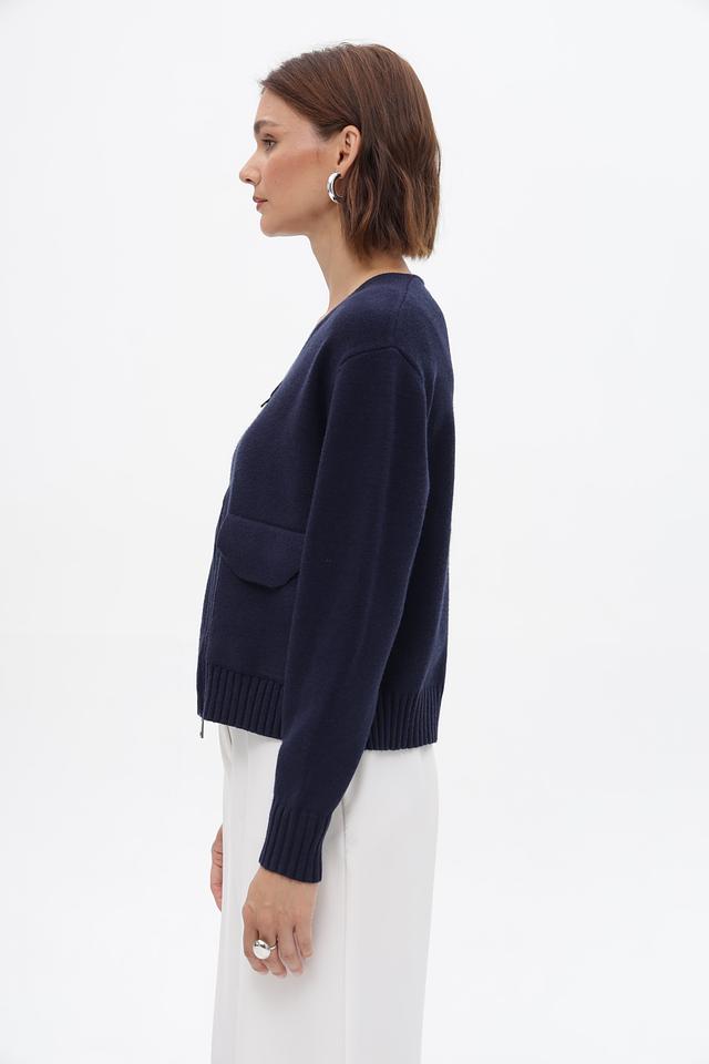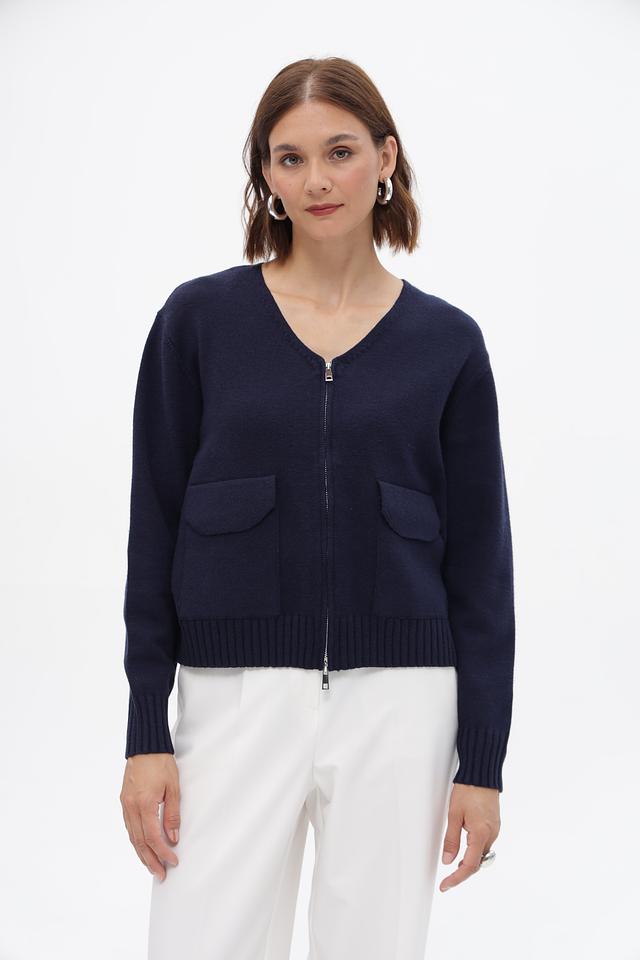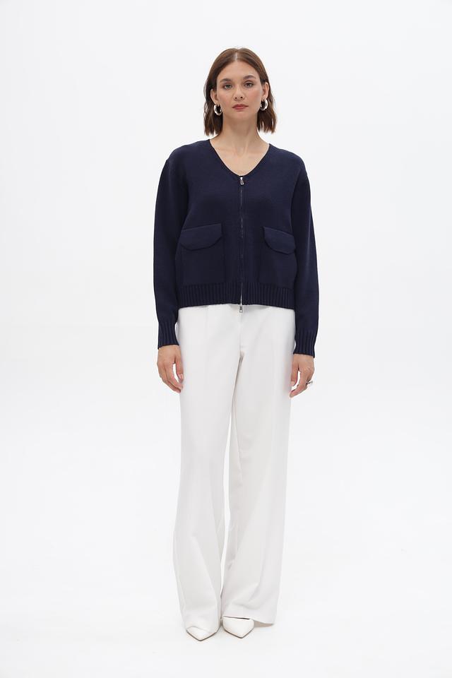 Вязаный жакет Marc Aurel тёмно-синего цвета с V-образным вырезом и застёжкой на молнию. Модель дополнена двумя накладными карманами и трикотажной резинкой по низу. Жакет выполнен из мягкого сочетания вискозы, полиэстера и полиамида. Состав: вискоза 50%, полиэстер 28%, полиамид 22%