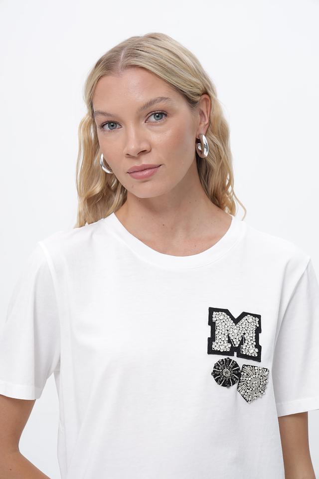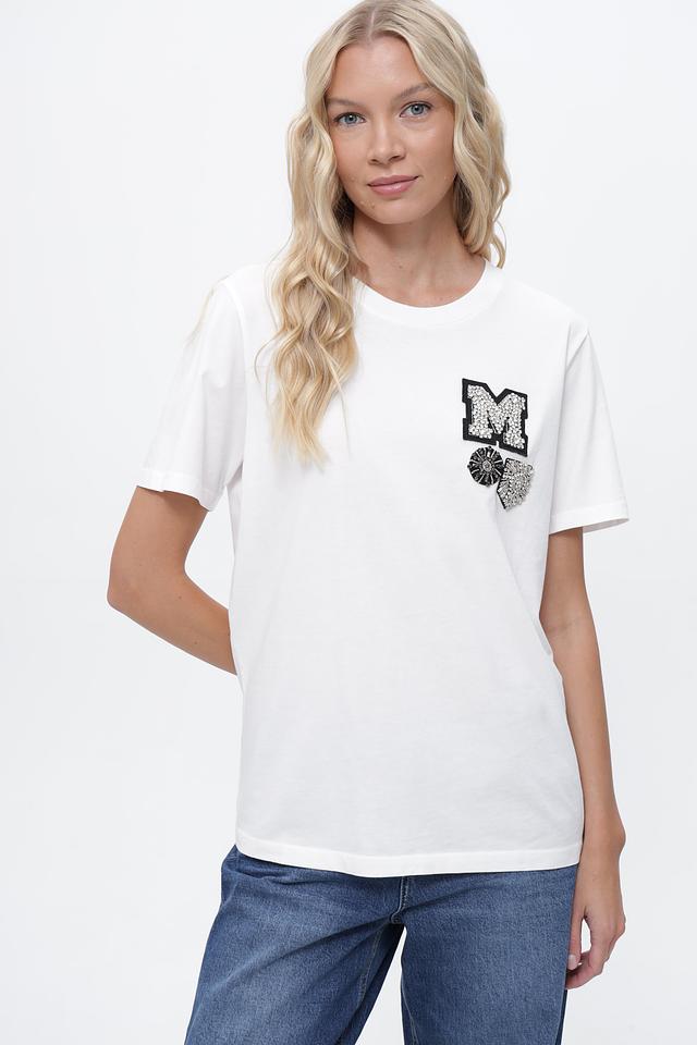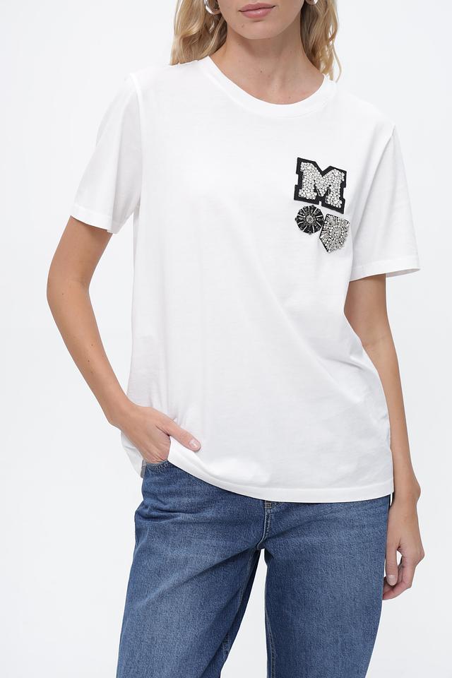 Особенность модели — стильная аппликация в виде буквы "M" и цветочного мотива, выполненная в черно-белой гамме. Этот декор добавляет футболке оригинальности и индивидуальности.