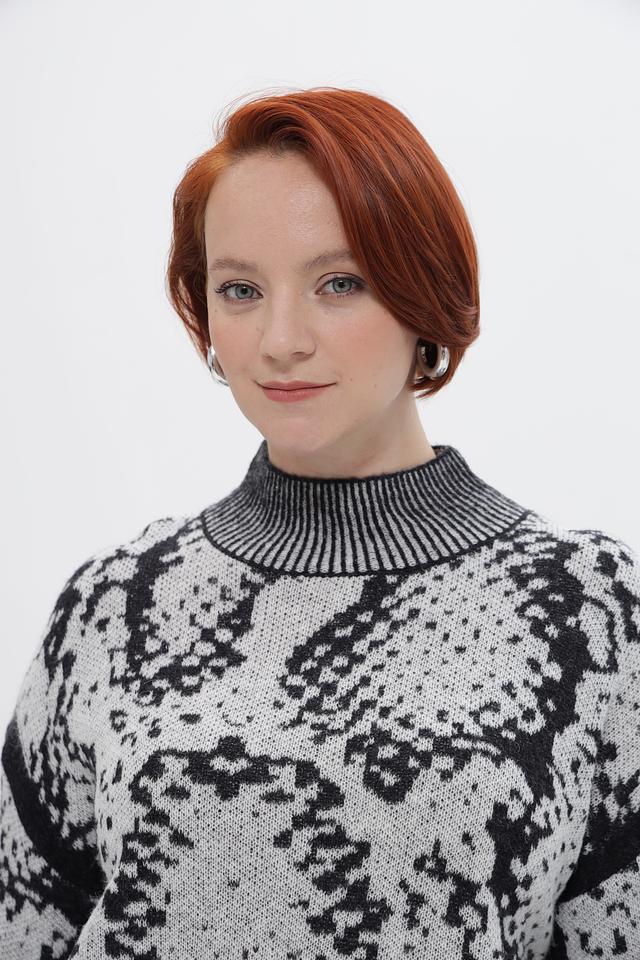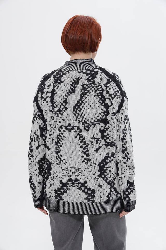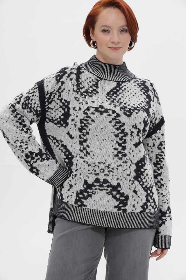 Пуловер имеет высокий воротник и свободный крой, обеспечивающий комфортную посадку по фигуре. Боковые разрезы добавляют динамики и позволяют создавать интересные многослойные образы.