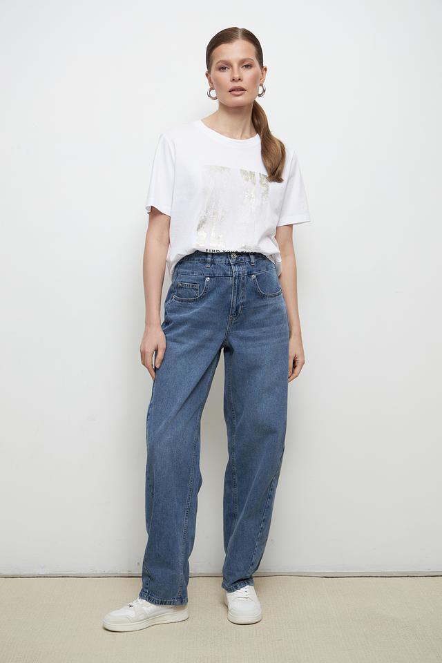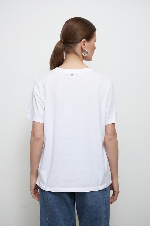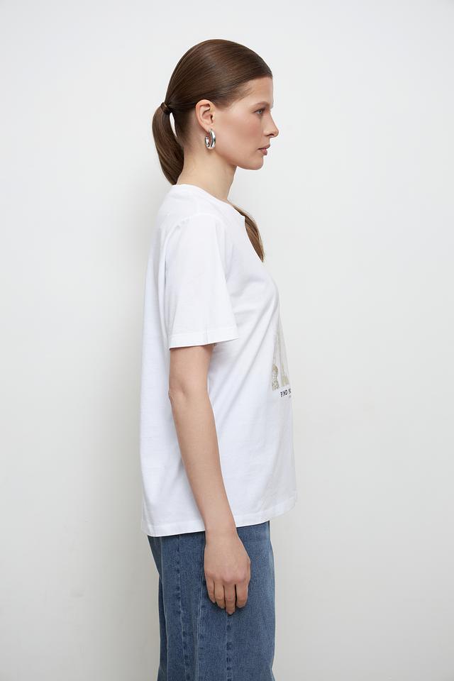 Футболка имеет прямой крой, короткие рукава и круглый вырез горловины. Она идеально подходит для создания повседневных образов, сочетаясь с джинсами, шортами или юбками. Благодаря своему универсальному дизайну, эта футболка легко впишется в любой стиль.