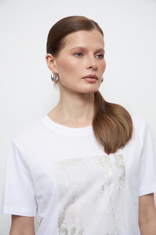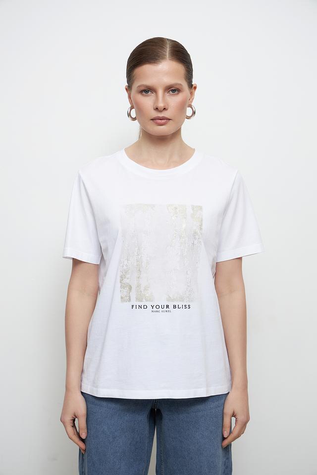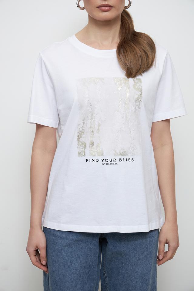 Белая футболка Marc Aurel с золотистым принтом и надписью "FIND YOUR BLISS". Изготовлена из 100% хлопка, обеспечивая комфорт и воздухопроницаемость. Стильный и лаконичный дизайн. Состав: хлопок 100%